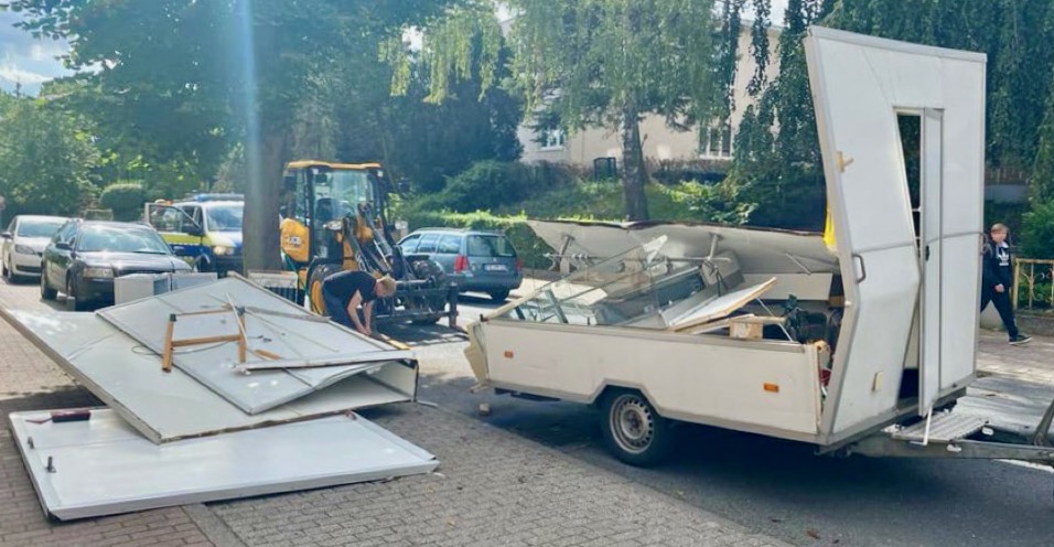 Der ist hin. Ein 49-Jähriger Fahrer ist heute mit seinem Pkw und Verkaufsanhänger in Altentreptow unterwegs gewesen. Plötzlich öffnete sich die Verkaufsklappe. Zeugen versuchten, den Fahrer des Gespanns durch Hupen zu warnen, doch er hörte sie nicht. Schließlich krachte die Klappe gegen einen Baum, der Verkaufswagen wurde dadurch komplett zerstört.