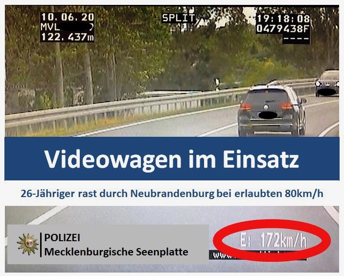 In Neubrandenburg war gestern der Videowagen unterwegs. Die Polizisten zogen dabei vier Fahrer aus dem Verkehr, die jetzt eine Weile zu Fuß gehen müssen. Sie hatten die zulässige Höchstgeschwindigkeit um mehr als 40 km/h überschritten