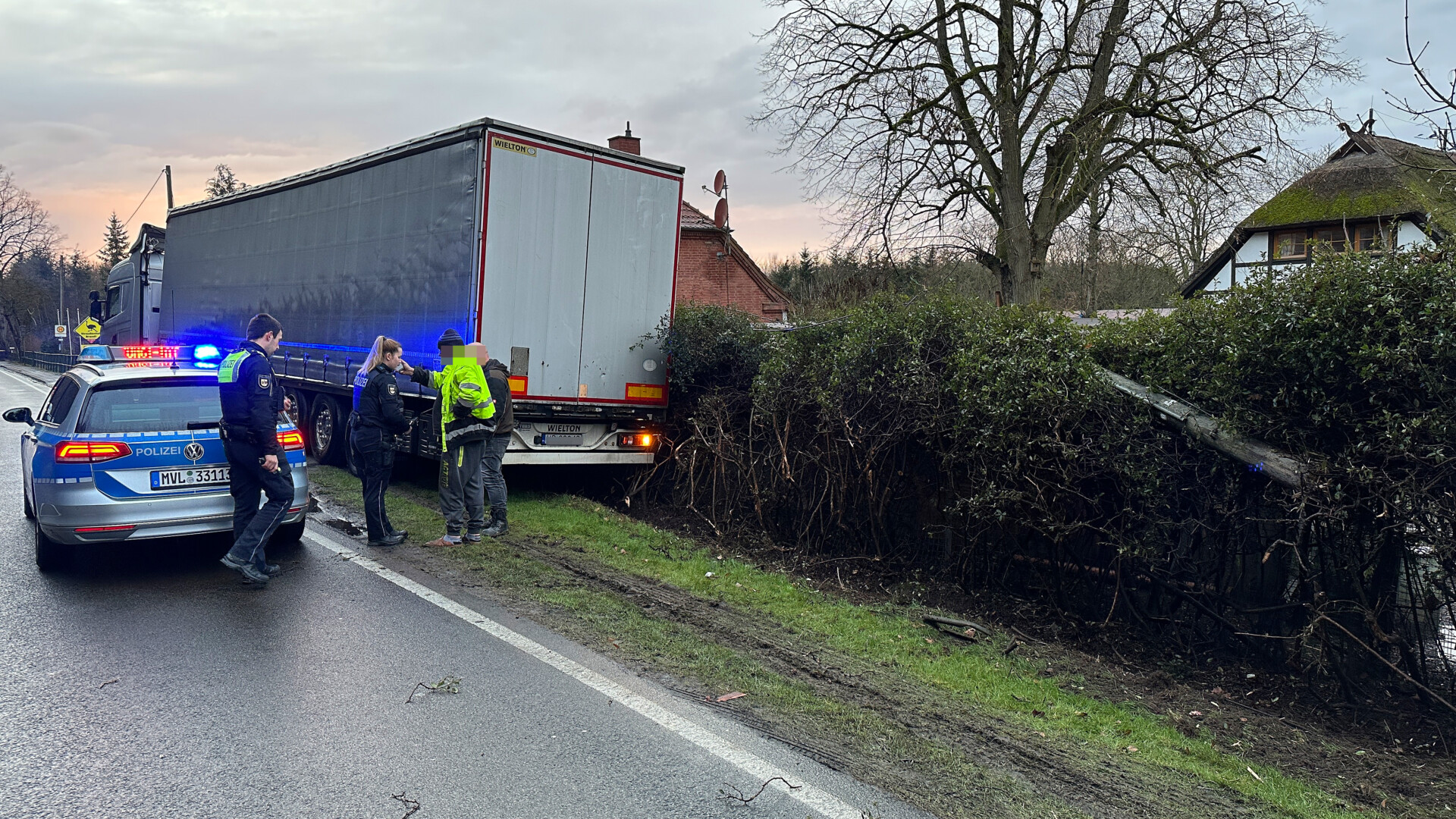 Auf der Bundesstraße 198, in Höhe der Ortschaft Vipperower Heide, ist am frühen Abend ein 40 Tonner verunglückt. Nach ersten Angaben kam der Fahrer mit seinem Sattelzug rechts von der Fahrbahn ab, prallte gegen einen Telefonmast und durchfuhr die Grundstücksgrenze abseits der Bundesstraße. Verletzt wurde glücklicherweise niemand.
