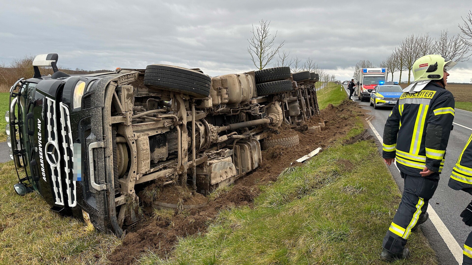 Der Fahrer konnte sich sich eigenständig aus seinem Führerhaus befreien. Alarmierte Rettungskräfte kümmerten sich anschließend um den Mann.