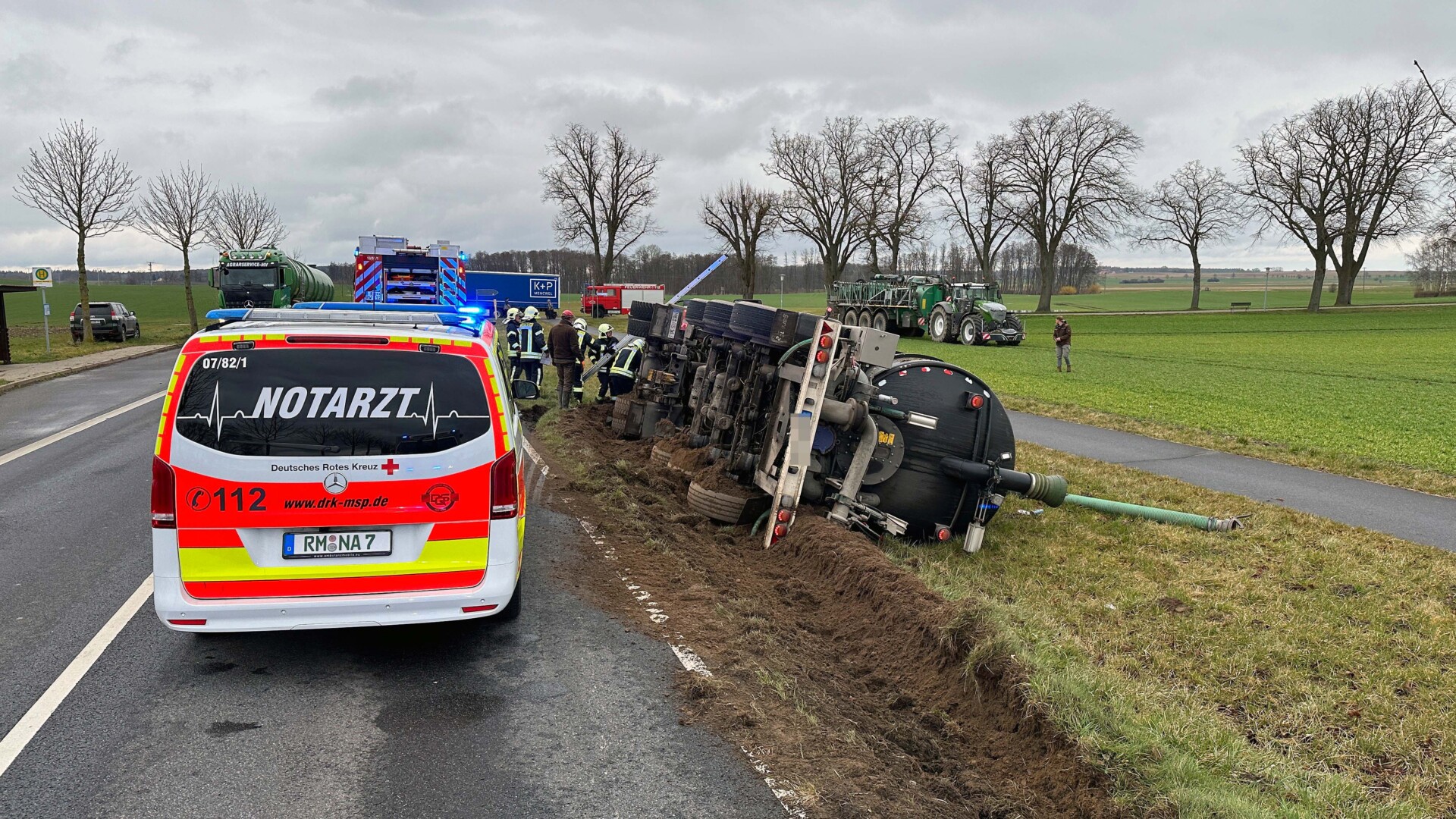 Auf der Landesstraße zwischen Röbel und Sietow hat sich am frühen Nachmittag ein schwerer Verkehrsunfall ereignet, bei dem eine Person leicht verletzt worden ist. Nach Polizeiangaben kam der 22-jährige Fahrer mit seinem 40-Tonner, beladen mit Gülle, offenbar aufgrund von Unaufmerksamkeit rechts von der Straße ab und stürzte anschließend auf die Seite.