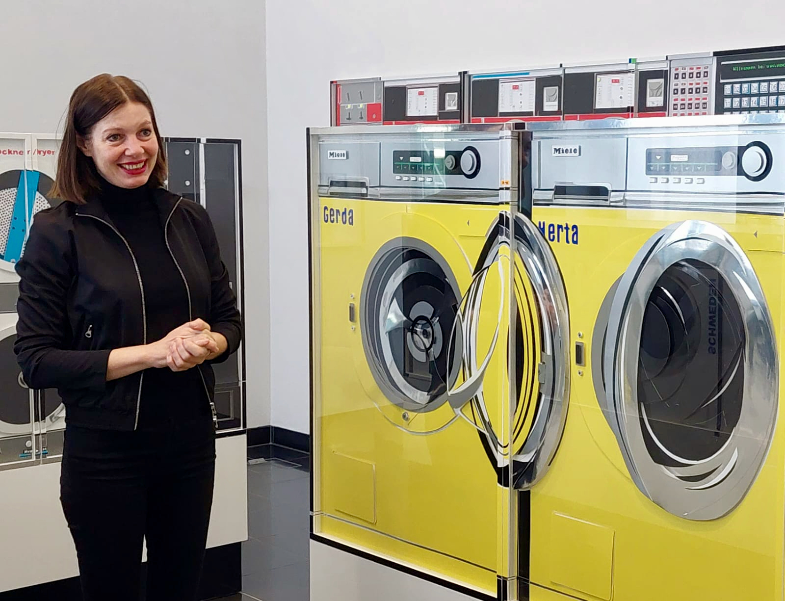 Etwa 50 Arbeiten von Marion Eichmann sind vom 14. April bis Anfang Juni zu sehen. Und man sieht ihnen den großen Papier- und Malaufwand nicht auf den ersten Blick an. Im Gegenteil: „Manchmal kamen schon Leute in mein Atelier, weil sie wirklich Wäsche waschen wollten“, erzählt die 47-jährige Künstlerin. Dabei bezieht sie sich auf eine ihrer größten Installationen – den „Waschsalon“, der bis in kleinste Details sogar die Namen der Maschinen abbildet. Täuschend echte Papiernachbildungen, auf denen Herta oder Gerda , sowie Polen oder Italien, oder auch Nummern stehen. Das dient der Orientierung in echten Waschsalons, kann man lernen.