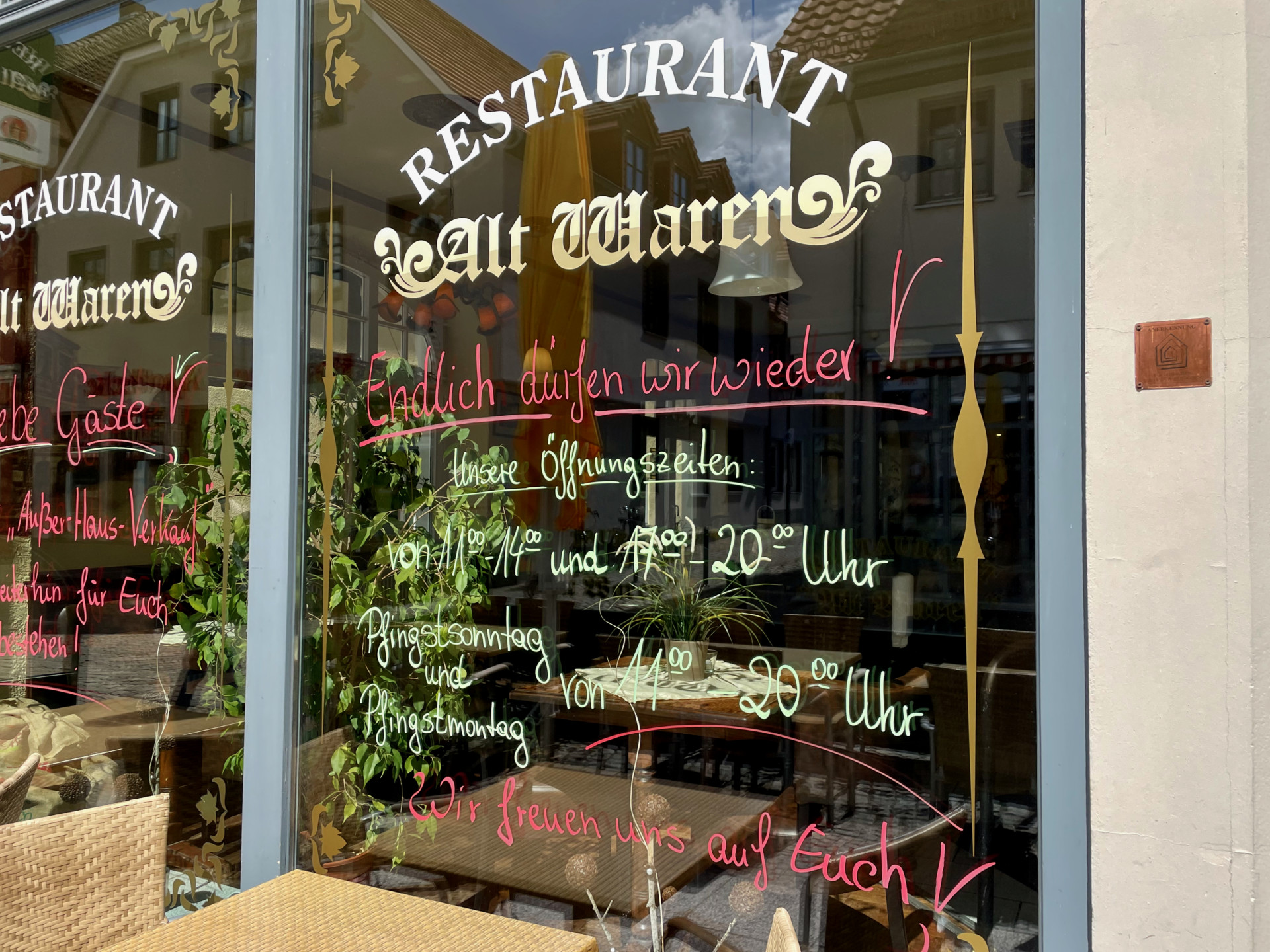 Diesem Gaststätten-Fenster in der Warener Innenstadt sieht man die Vorfreude der Mitarbeiter auf die Gäste, die ab Sonntag wieder kommen dürfen, regelrecht an.