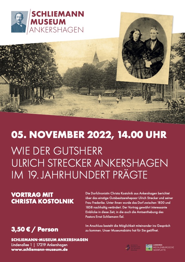 Am kommenden Sonnabend, 5. November, gibt’s im Heinrich-Schliemann-Museum Ankershagen einen interessanten Vortrag der Dorf-Chronistin Christa Kostolnik. Sie berichtet über das einstige Gutsbesitzer-Ehepaar Ulrich und Frederike Strecker, das den kleinen Ort Ankershagen im 19. Jahrhundert nachhaltig prägte.