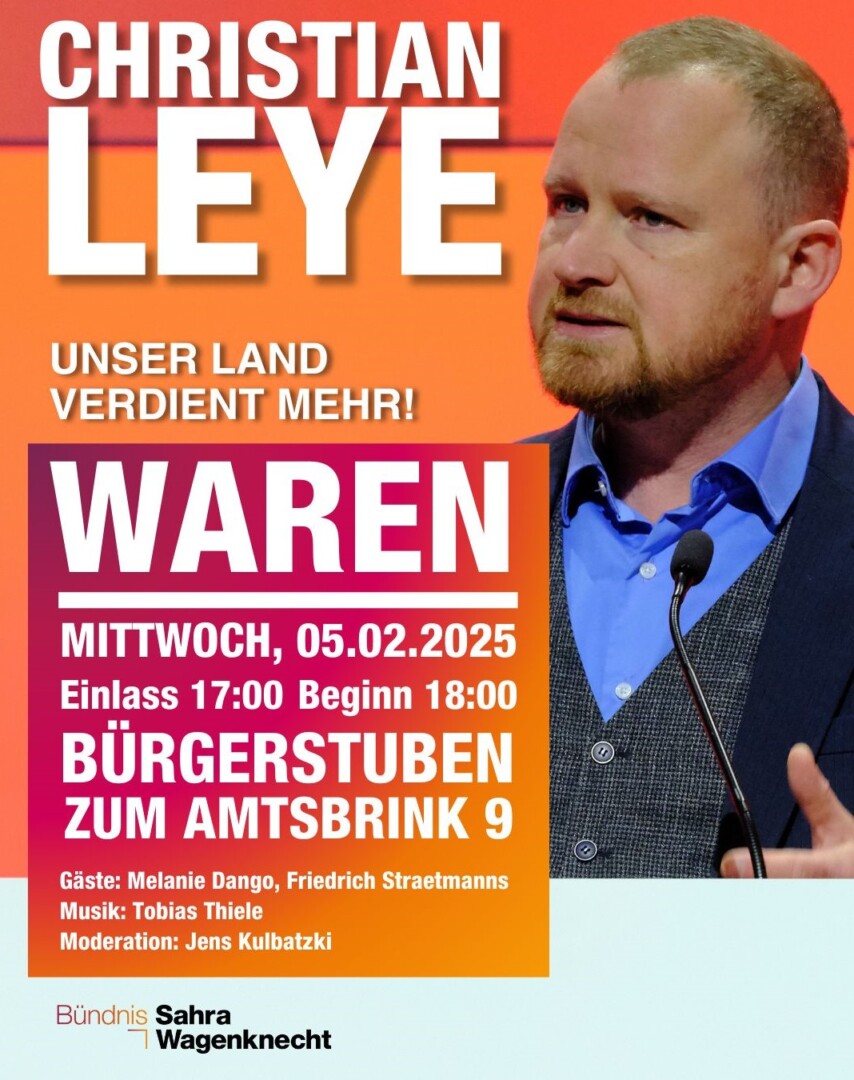 Wahlkampf: Der Generalsekretär des Bündnis Sahra Wagenknecht (BSW), Christian Leye, ist zum Auftakt einer Veranstaltungsreihe im Vorfeld der Bundestagswahl am Mittwoch, 5. Februar, zu Gast in Waren. Er wird ab 18 Uhr über Probleme im Land sprechen und für Fragen zur Verfügung stehen.