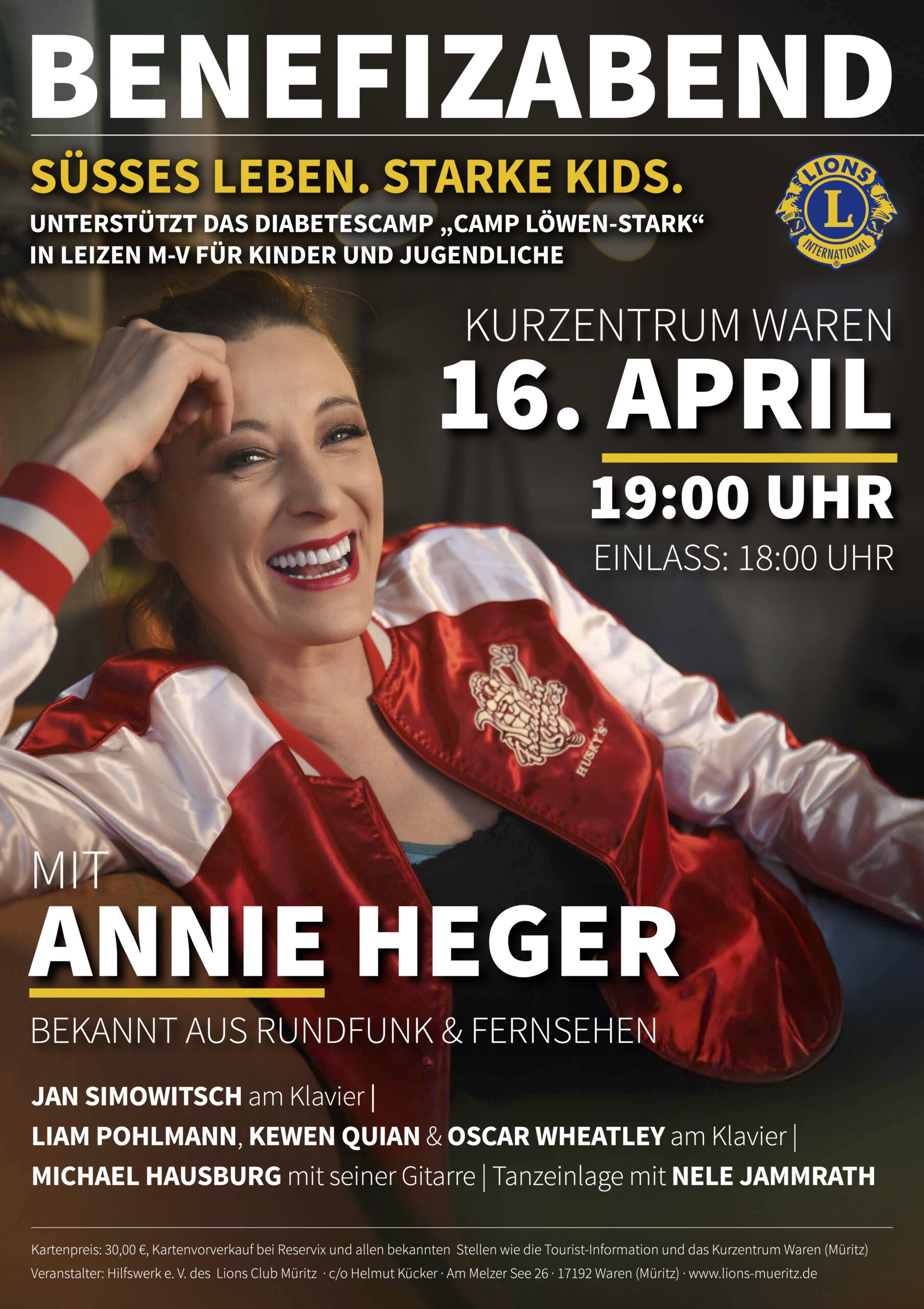 Hier heißt es, schon mal rechtzeitig Karten sichern: Das Hilfswerk des Lions Club Müritz lädt am 16. April ab 19 Uhr zu einer Benefizveranstaltung in das Kurzentrum Waren ein. Die Moderation übernimmt Annie Heger. Liam Pohlmann wird am Klavier Soundtracks aus „Die fabelhafte Welt der Amelie“ präsentieren, und die beiden Schüler des Internatsgymnasiums Schloss Torgelow, Kewen Quian sowie Oscar Wheatley unterhalten ebenfalls mit Klaviermusik.