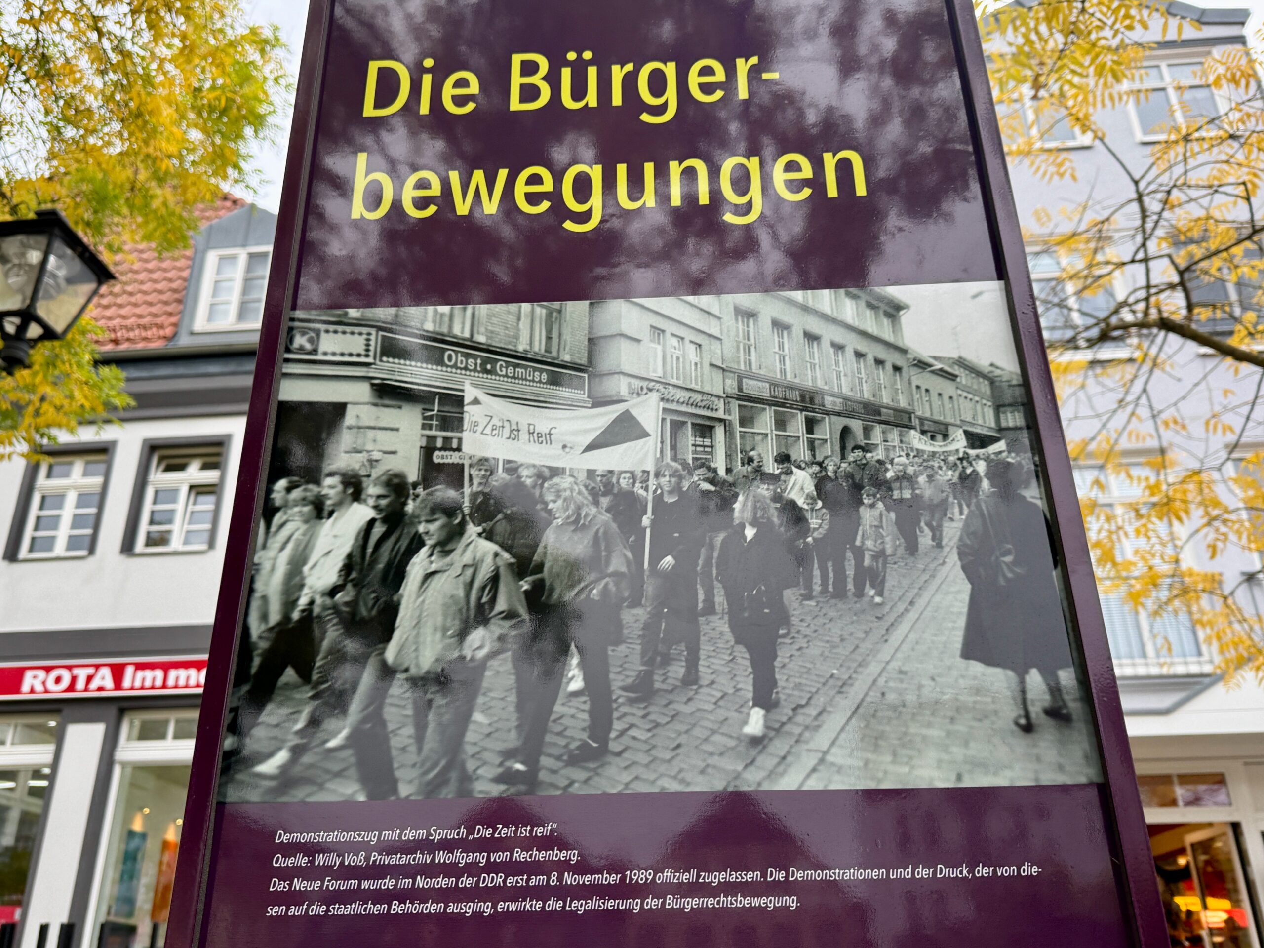 Mit der Eröffnung der neuen Freiluftausstellung soll heute nun ein weiterer bedeutender Schritt in der Erinnerungskultur zum Thema „Friedliche Revolution 1989“ vollzogen werden. Die Ausstellung bietet an ihren sechs Stationen einen Einblick in die Ereignisse des Herbstes 1989 und würdigt die Menschen, die für die Freiheit kämpften und die Diktatur überwanden. Die neuen Stelen stehen an der Georgenkirche, an der Marienkirche, auf dem euen Markt, am ehemaligen Staisgebäude auf dem Mühlenberg, an der Turnhalle in der Feldstraße sowie am Hafen.
