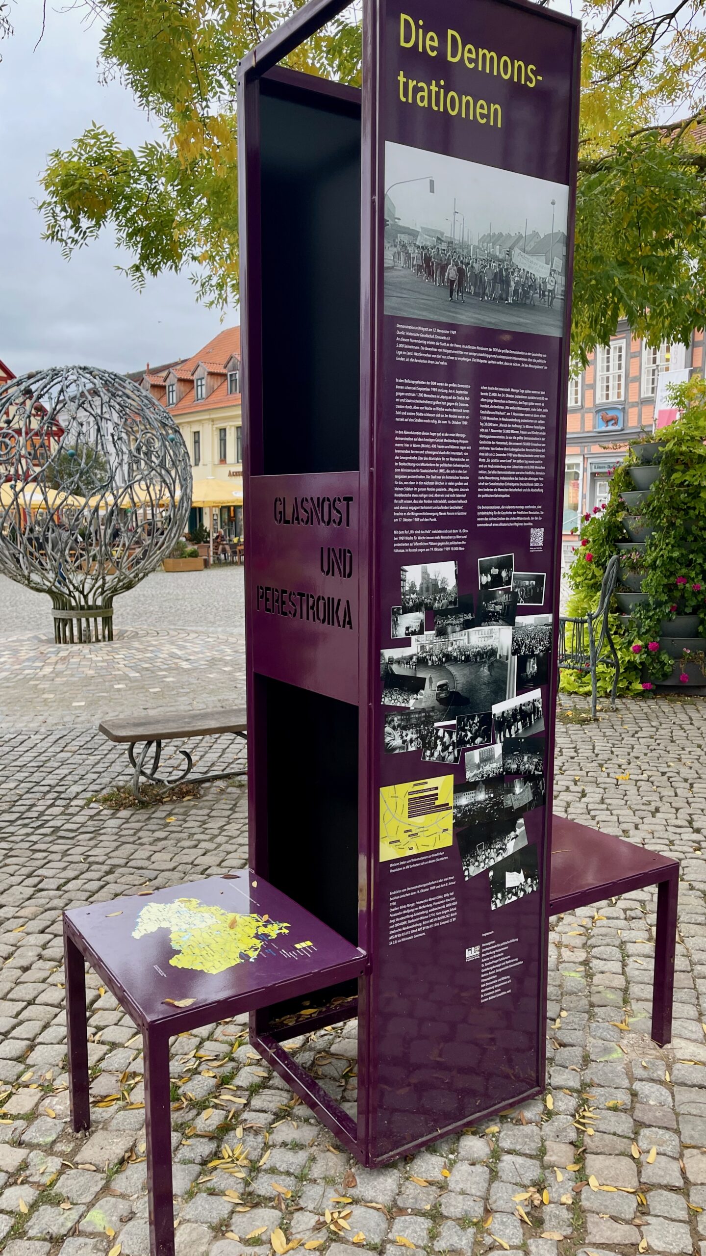 Dem einen oder anderen wird es schon aufgefallen sein – in Warens Stadtbild hat sich etwas verändert. An sechs verschiedenen Standorten stehen weinrote Stelen, versehen mit Bildern und Informationen von den Protesten im Herbst 1989. Sie sind Bestandteil der Ausstellung „Friedliche Revolution 1989 in Mecklenburg und Vorpommern“, die heute Abend um 17.30 Uhr offiziell eröffnet wird.