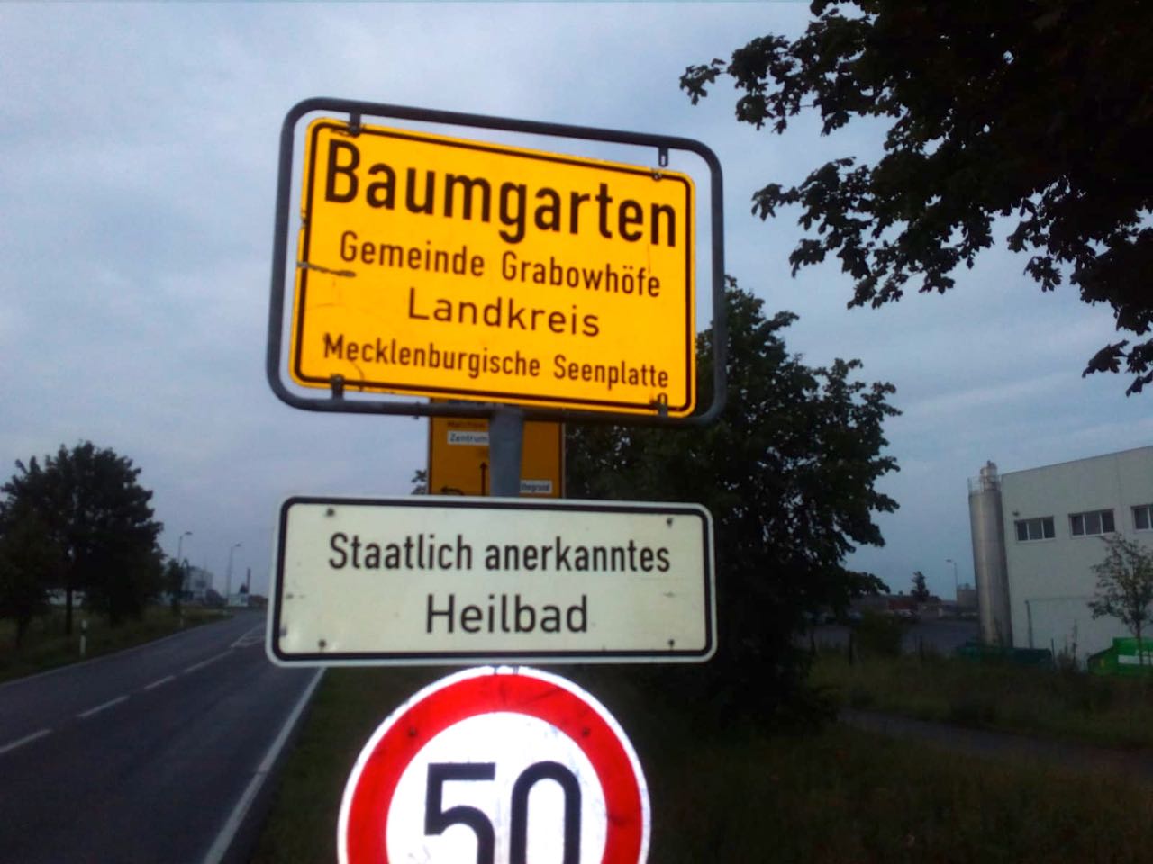Die Stadt Waren gehört jetzt zur Gemeinde Grabowhöfe. Steht zumindest am Ortseingang aus Richtung Teterow kommend. Unbekannte Scherzbolde habe das Ortseingangsschild in Baumgarten abmontiert und in Waren eingesetzt.
