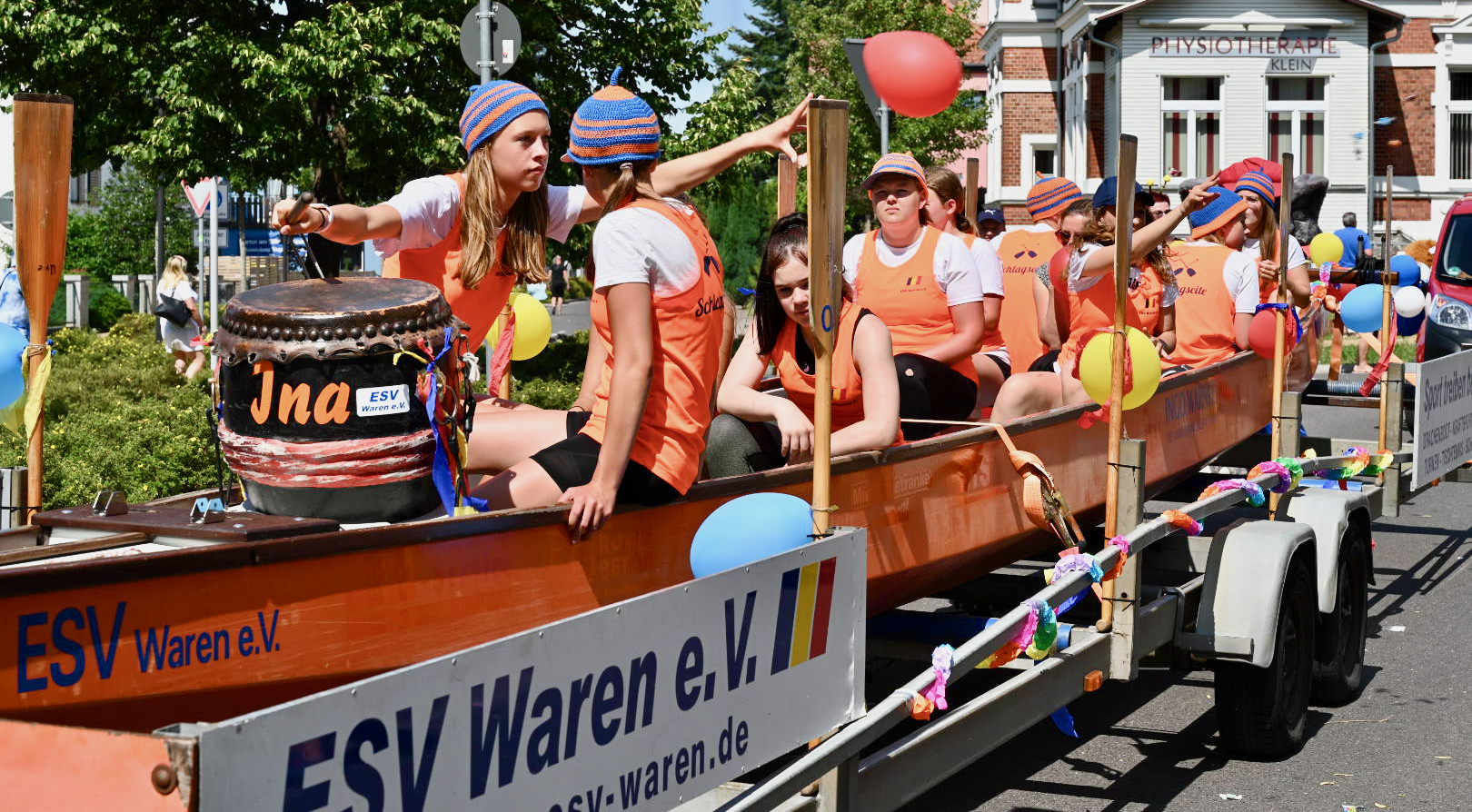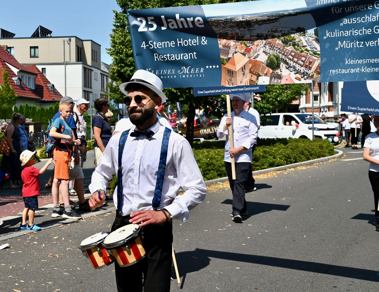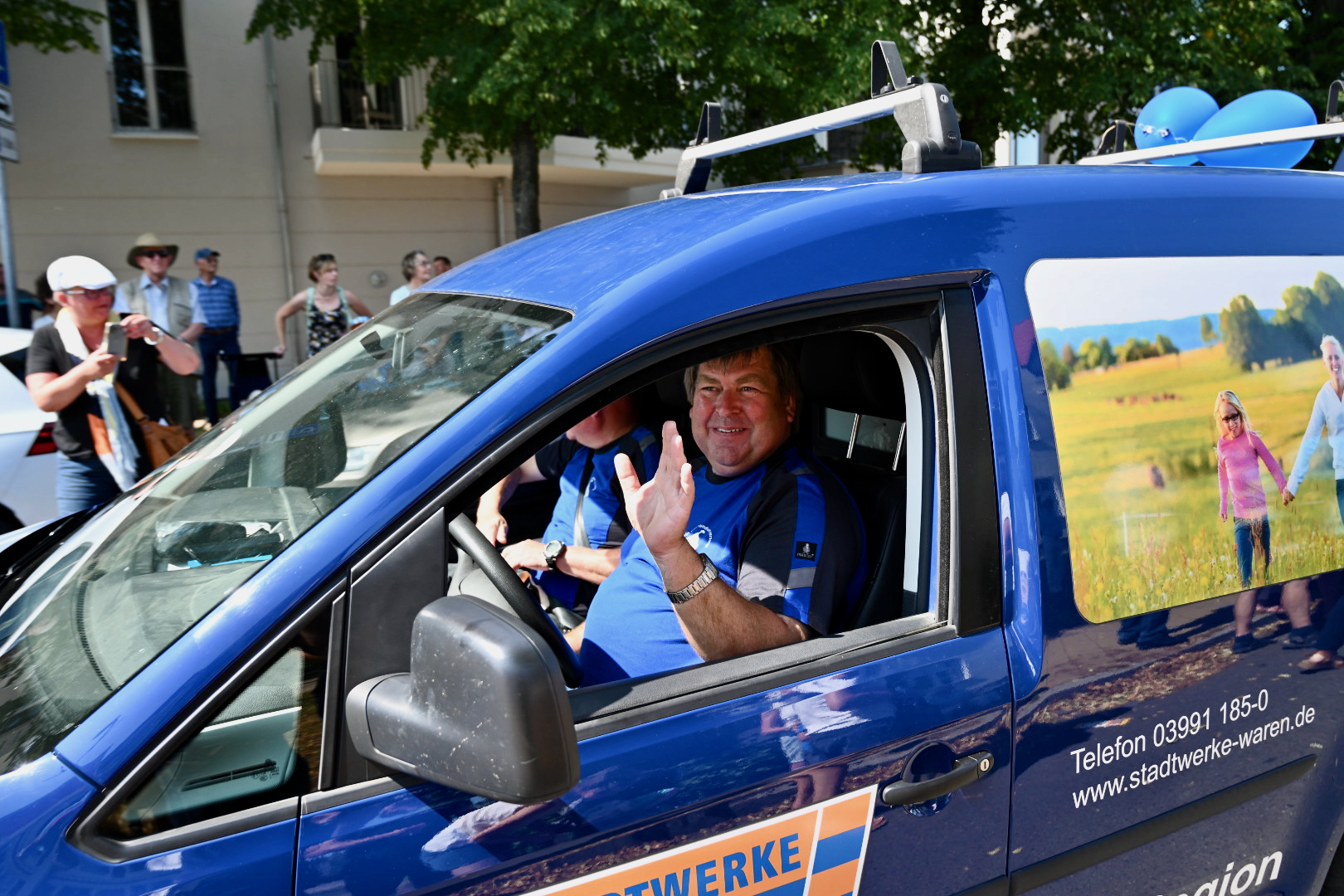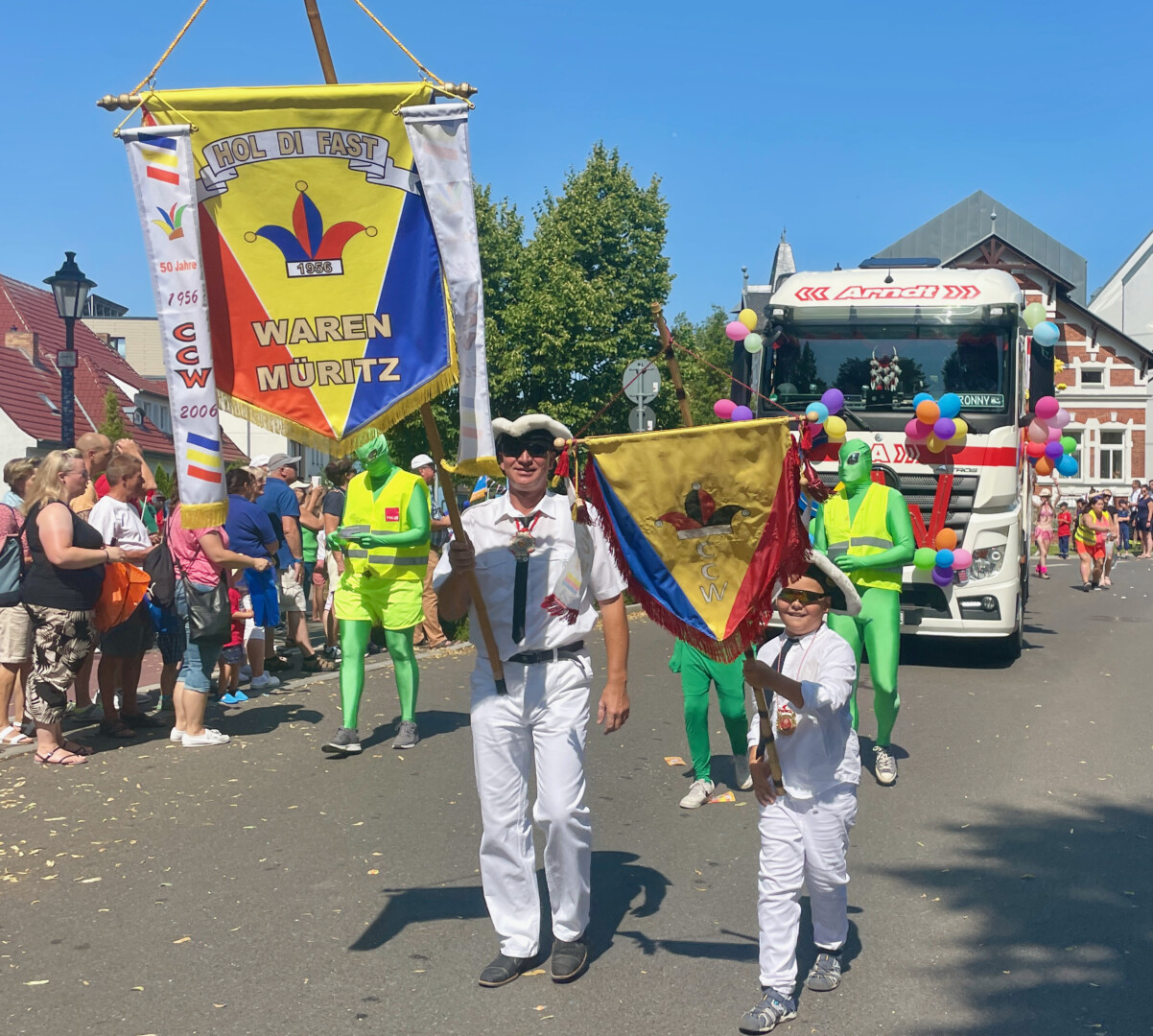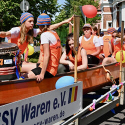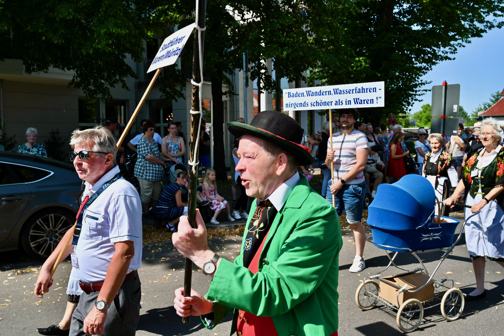 Fast 40 Unternehmen, Vereine und Verbände zogen heute bei brütender Hitze durch Waren und begeisterten die vielen Zuschauer am Straßenrand. Die Schattenplätze links und rechts der Fahrbahn waren heiß begehrt. Und auch wenn der eine oder andere Zuschauer versuchte, Vergleiche mit anderen Städten zu ziehen – wir machen’s nicht und sagen eindeutig: Es war ein toller Umzug.