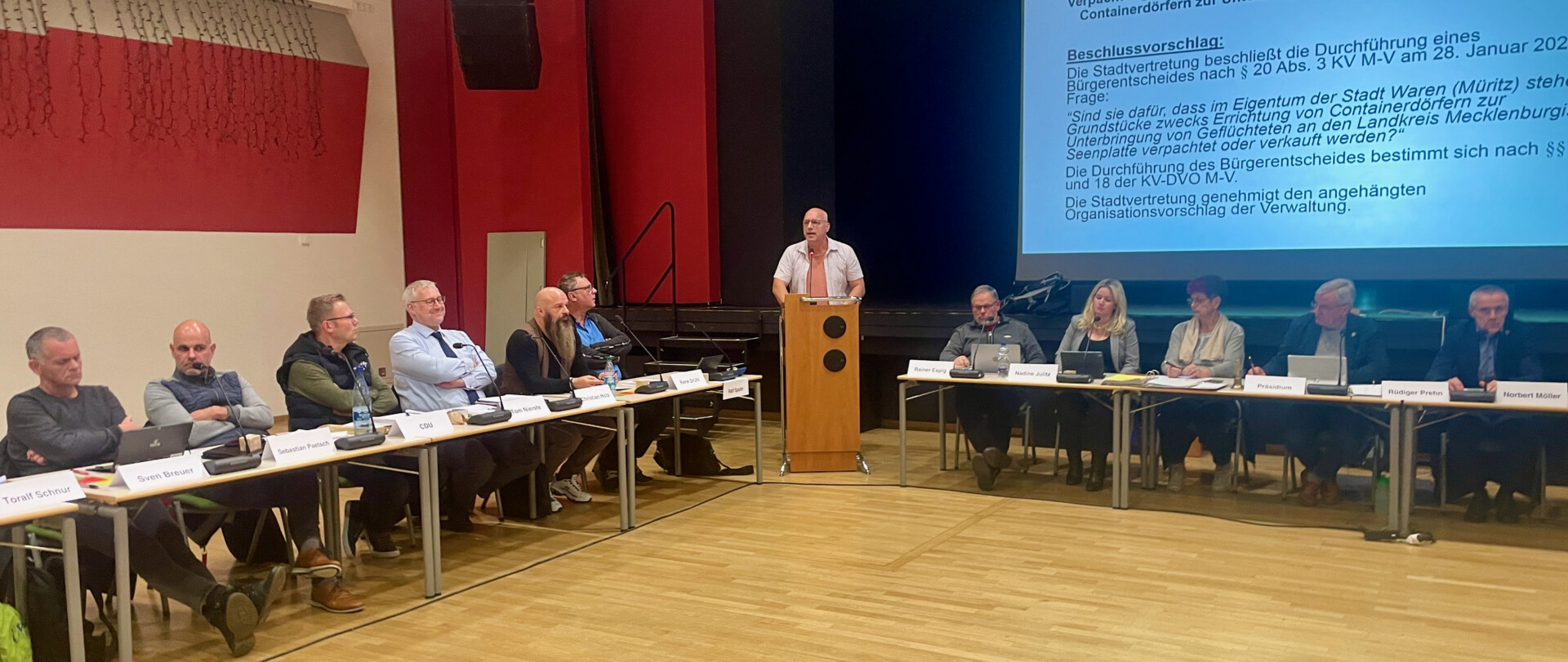 Beim Bürgerentscheid, und das machten die Vertreter aller Parteien noch einmal deutlich, geht es nicht um die Frage, ob Flüchtlinge nach Waren kommen oder nicht. Vielmehr stimmen die Wähler über die Frage ab: „Sind Sie dafür, dass im Eigentum der Stadt Waren (Müritz) stehende Grundstücke zwecks Errichtung von Containerdörfern zur Unterbringung von Geflüchteten an den Landkreis Mecklenburgische Seenplatte verpachtet oder verkauft werden?“