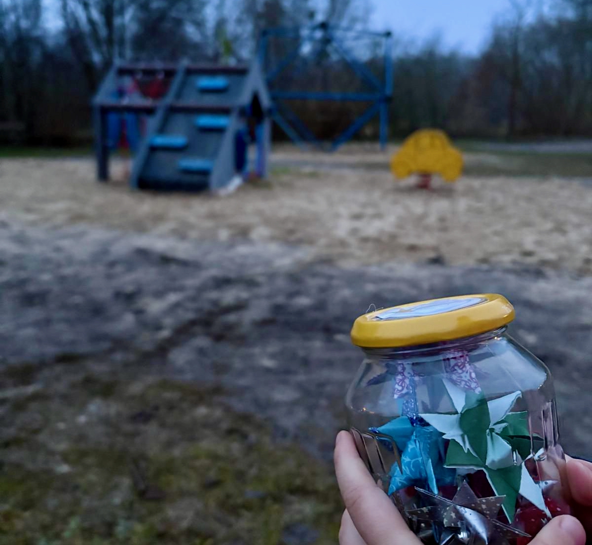 Anderen eine Freude machen. Einfach so. Ohne Gegenleistung und ohne sich öffentlich zu präsentieren: Eine Warener Familie hat daran ganz viel Spaß. Seit zwei Jahren versteckt sie auf Spielplätzen in der Stadt sogenannte Fröbelsterne. Das sind dreidimensionale selbst gebastelte Papiersterne. In Gläsern verpackt stehen sie seit der letzten Nacht auf den Spielplätzen, dazu ein kleiner, liebevoll formulierte Hinweis, dass sich die Finder einen Stern mitnehmen können.