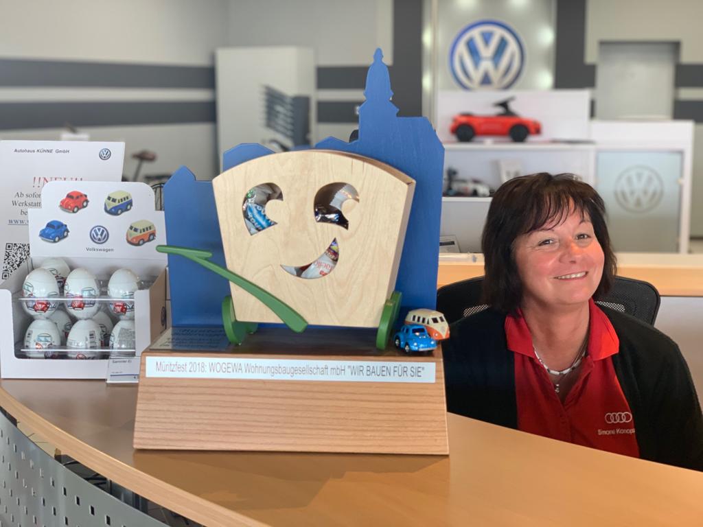 Sie waren schrill, sie waren laut, sie waren cool und sie haben unwahrscheinlich viel Stimmung gemacht: Das VW-Autohaus Kühne hat bekanntlich – wir berichteten bereits – den Wanderpokal der Stadt Waren für das beste Bild im Müritzfest-Umzug geholt. Gestern nun ist dieser Pokal in Form eines Bollerwagens auch im Autohaus angekommen und steht jetzt zunächst direkt am Service-Tresen. Schließlich sind die Mitarbeiter des Hauses stolz auf diesen Preis und wollen ihn auch zeigen. Zur offiziellen Übergabe rückten gestern Warens stellvertretender Bürgermeister Dietmar Henkel und Liane Klischewski, Mitarbeiterin im Kulturbereich, an.
