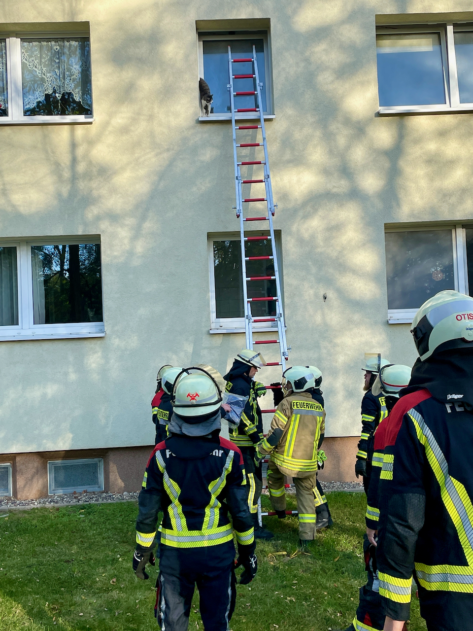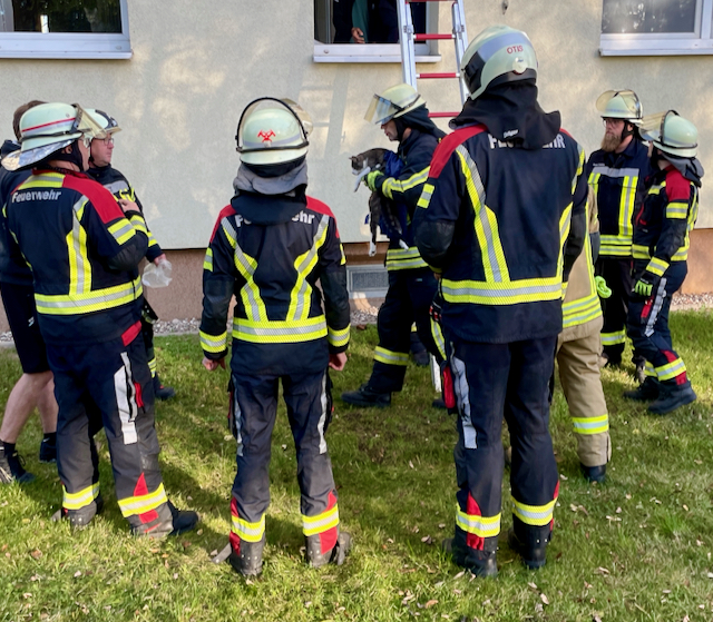 Erst heute früh haben wir einen Beitrag über die hohe Zahl der Feuerwehreinsätze in Waren geschrieben und darüber, dass die ehrenamtlichen Retter zu jeder Tages- und Nachtzeit zur Stelle sind, wenn jemand in Not ist. Das gilt auch für Tiere, wie sich heute Vormittag gezeigt hat. Aufmerksame Anwohner haben zuerst das Jaulen einer Katze gehört, später wurde sie entdeckt: Eingeklemmt in einem gekippten Fenster in der zweiten Etage eines Hauses in der Hans-Beimler-Straße. So hing das Tier offenbar mindestens eine Stunde. Der Mieter der Wohnung war zu diesem Zeitpunkt nicht zu Hause. Um die Katze, die keinen Mucks mehr von sich gab, zu erreichen, reichte den Feuerwehrleuten letztlich eine längere Leiter. Behutsam hob ein Kamerad die sichtlich geschwächte Samtpfote mit Hilfe einer Decke aus ihrem „Gefängnis“. Zwischenzeitlich traf der Besitzer an der Leiter ein – ebenfalls sichtlich mitgenommen und mit Tränen in den Augen. Erleichtert nahm er die Katze entgegen, wurde sogar noch von den Feuerwehrleuten getröstet und versprach: Das Fenster bleibt nicht mehr gekippt, wenn er aus dem Haus geht.