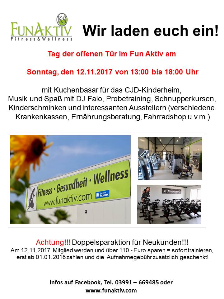 Schon mal vormerken: Das Warener Fitnessstudio „FunAktiv“ von Kristin Schmuck hat für den 12. November einen Tag der offenen Tür mit umfangreichem Programm organisiert.
