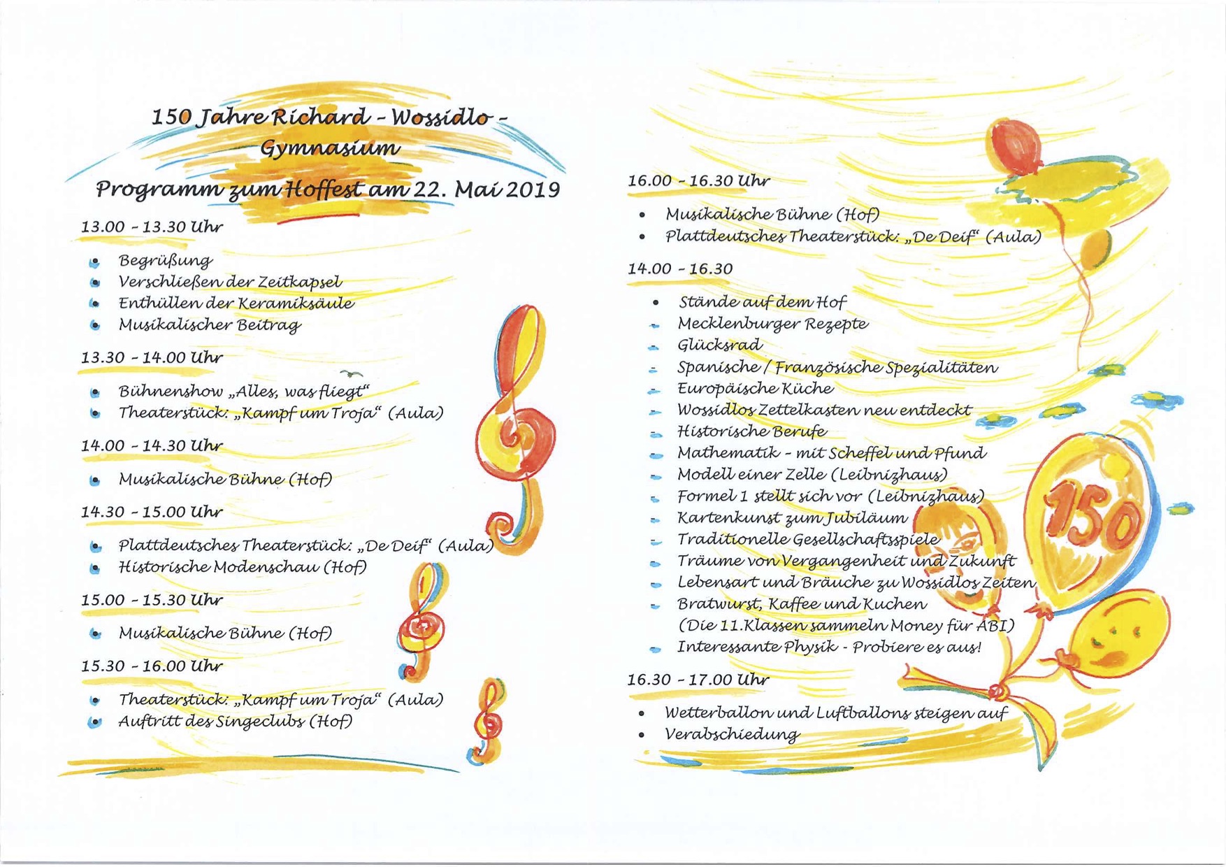 Das Warener Richard-Wossidlo-Gymnasium feiert in diesem Jahr den 150. Geburtstag. Aus diesem Anlass ist für den heutigen Nachmittag ein Hoffest für Jedermann geplant.