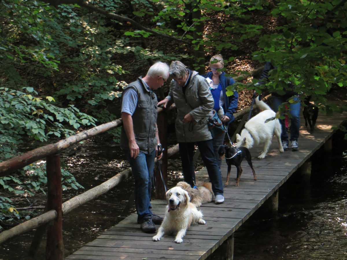 Der Rückweg führte am Standort des ehemaligen Schlosses Kuchelmiß vorbei. Zum Abschluß der Wanderung wurden die Hunde vor die Aufgabe gestellt, entweder ein Wasserhindernis zu  durchqueren oder den Weg über eine nahe Brücke zu wählen, um zu ihren Menschen zu kommen. Jeder Hund löste diese Aufgabe auf die von ihm bevorzugte Weise schwimmend oder trockenen Fußes.