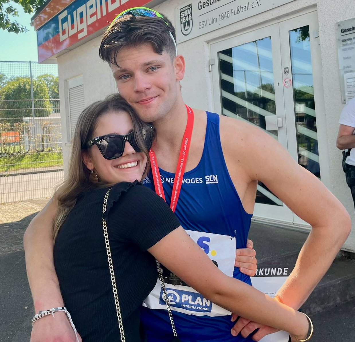 Er hat es geschafft! Der Warener Leichtathlet Elija Ziem ist heute Deutscher U20-Meister im 800-Meter-Lauf in Ulm geworden und hat somit die Fahrkarte für die Weltmeisterschaften gelöst. Die finden Anfang August in der kolumbianischen Stadt Cali statt. Elija – auf dem Bild mit seiner jüngeren Schwester Carlotta – lief trotz großer Konkurrenz von Anfang an vorne und siegte schließlich souverän mit einer Zeit von 1:49,22 Minuten. Neben seiner Schwester wurde er unter anderem auch von Mama und Papa angefeuert.