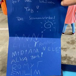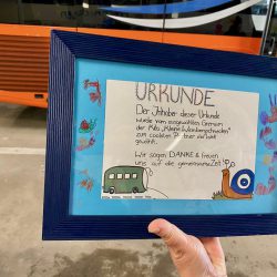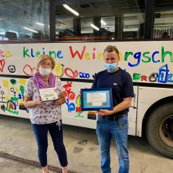 Herr Funk und Frau Groppe vom MVVG begleiteten die Malaktion und waren sichtlich gerührt, als sie zum Abschied Urkunden von den Kindern erhielten. Zum Mittagessen waren alle Kinder wieder zurück in der Kita und ganz stolz auf ihren Weinbergschneckenbus.