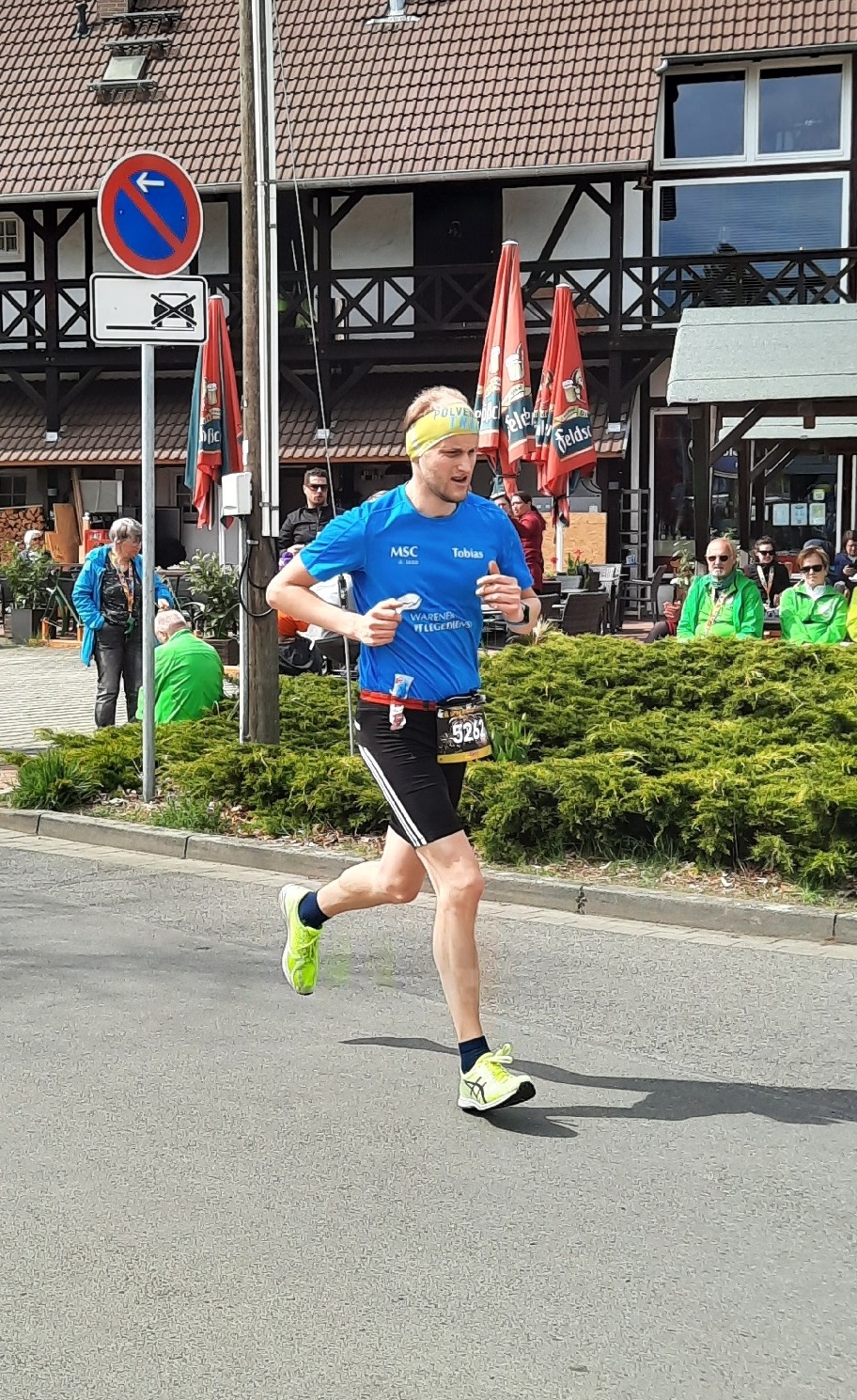 Tobias startete gut in den Lauf, hat schnell sein Tempo gefunden und schaffte es, sich bei Kilometer 10 auf Platz 3 vorzukämpfen. Auf der zweiten Streckenhälfte, ab ca. Kilometer 23, hatten alle Athleten mit mäßigem bis kräftigem Gegenwind zu kämpfen, dieser machte sich auch bei dem Warener Läufer bemerkbar, und er konnte sein Tempo nicht mehr halten. Er wurde bis zum Ziel noch von einigen Läufern überholt, konnte sich aber mit einer Zeit von 3:18:53 h über einen sehr guten 10. Platz freuen. In seiner Altersklasse belegte er sogar den ersten Platz. Damit hatte sich die Anreise in den Spreewald für Tobias gelohnt.