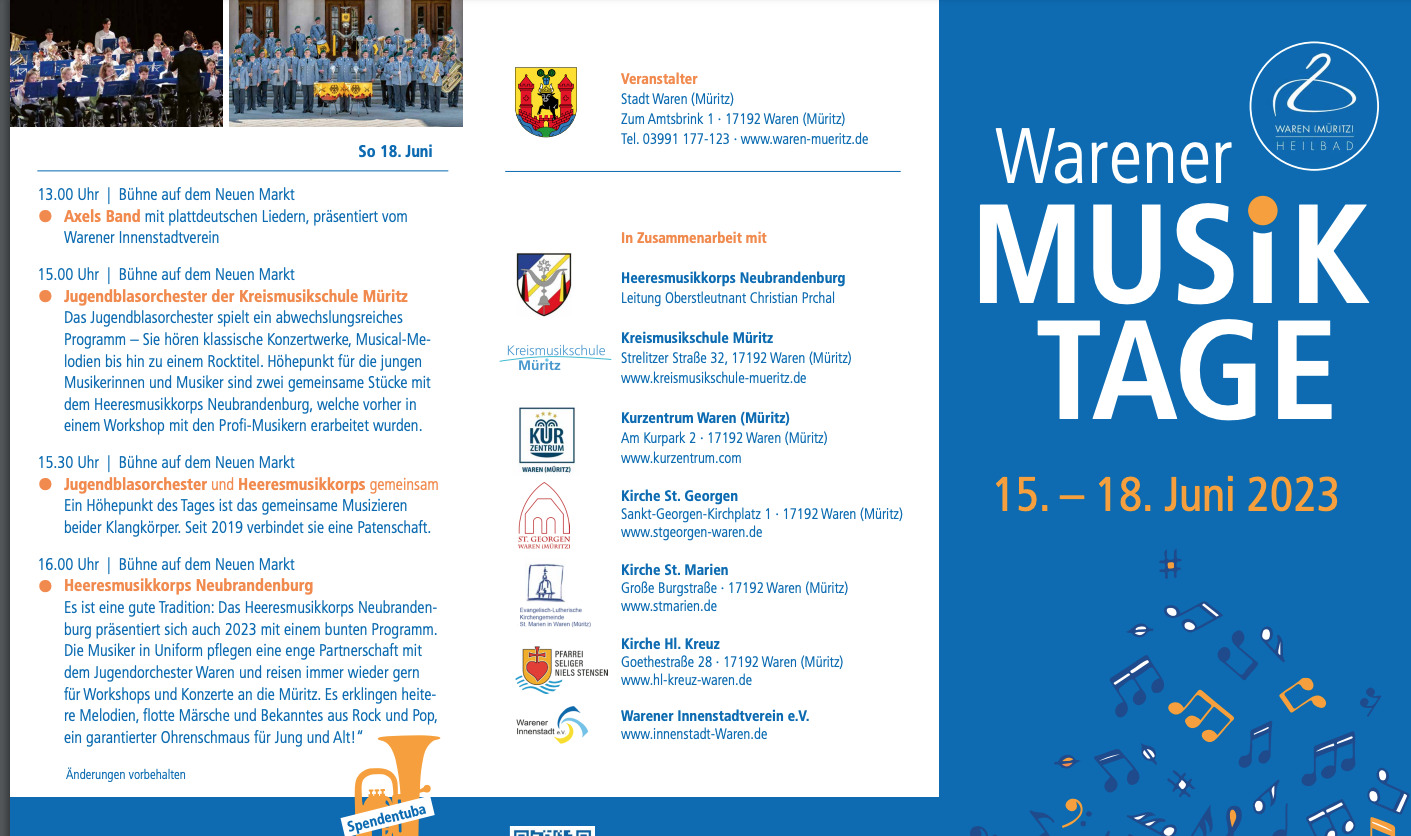 Einen Tag später, Sonntag, 18. Juni, geht’s um 11 Uhr mit verschiedenen Benefizkonzerten weiter. Es spielen das Warener Blasorchester, Axels Band, das Jugendblasorchester der Kreismusikschule und das Heeresmusikkorps Neubrandenburg.