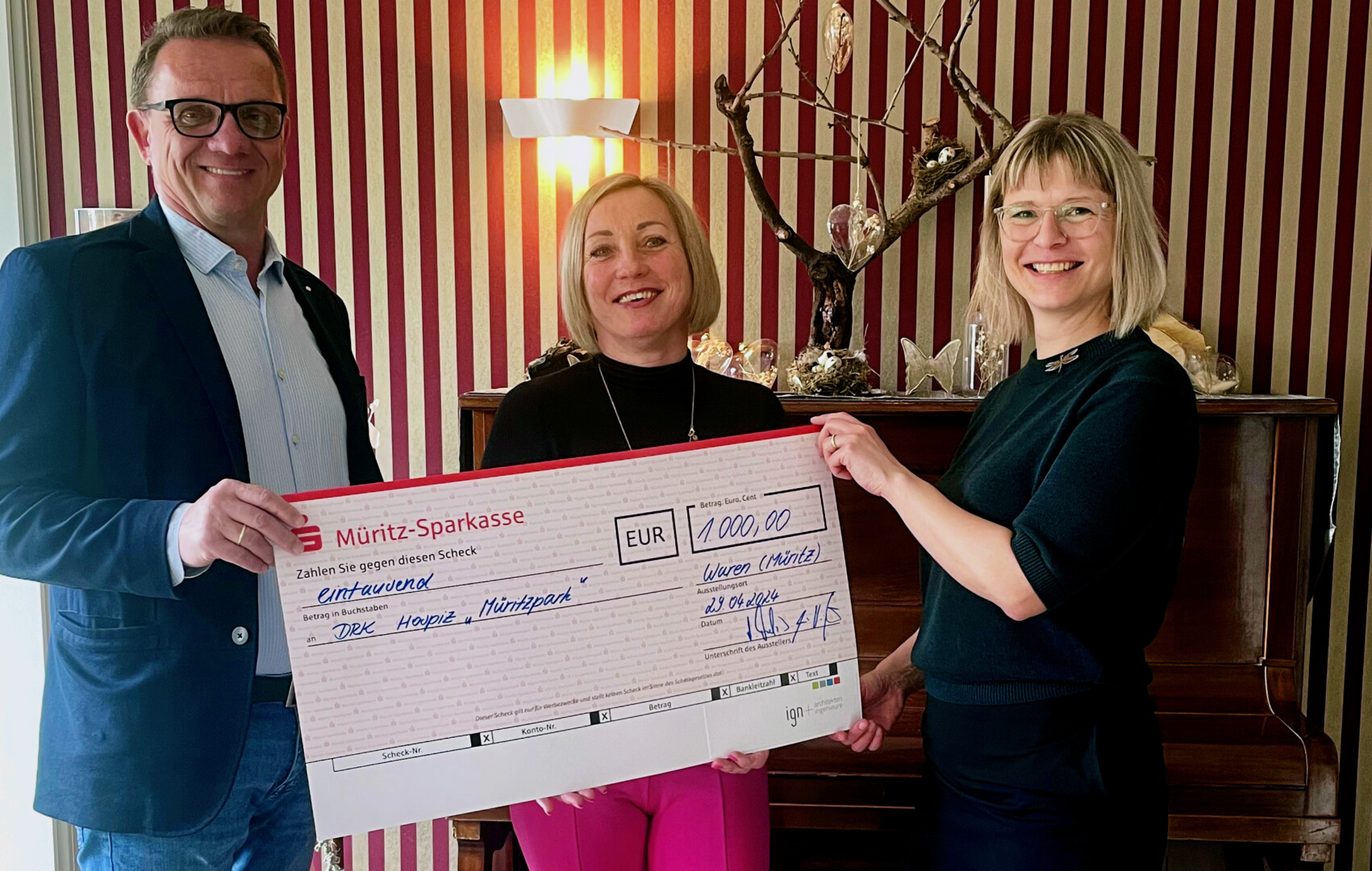 „Wir danken dem Team vom Hospiz ‚Müritzpark‘ für ihre aufopferungsvolle Arbeit und freuen uns, mit der Geldspende ihr Wirken zu unterstützen“, so ign-Chef André Melzer und Mitarbeiterin Susanne Lüttich bei der Übergabe an Hospizchefin Claudia Bajorat.
