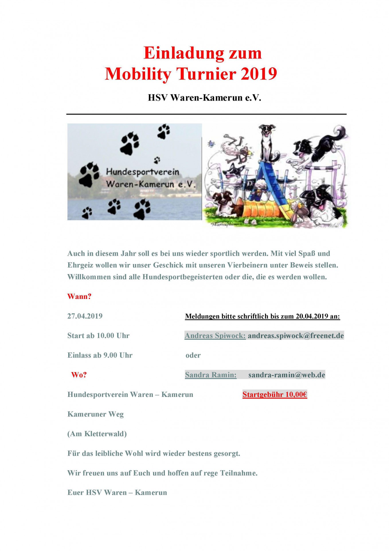Der Hundesportverein Waren-Kamerun richtet im April ein sogenanntes Mobility Turnier aus. Dazu lädt der Verein alle Hundesportbegeisterten ein. Es kann jeder teilnehmen, dessen Hund mindestens 12 Monate alt ist, eine gültige Tollwutimpfung sowie eine abgeschlossene Hundehaftpflichtversicherung nachweisen kann.