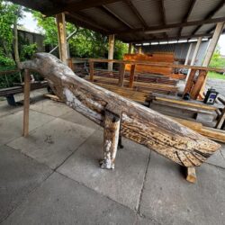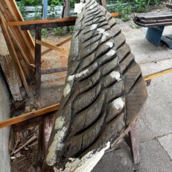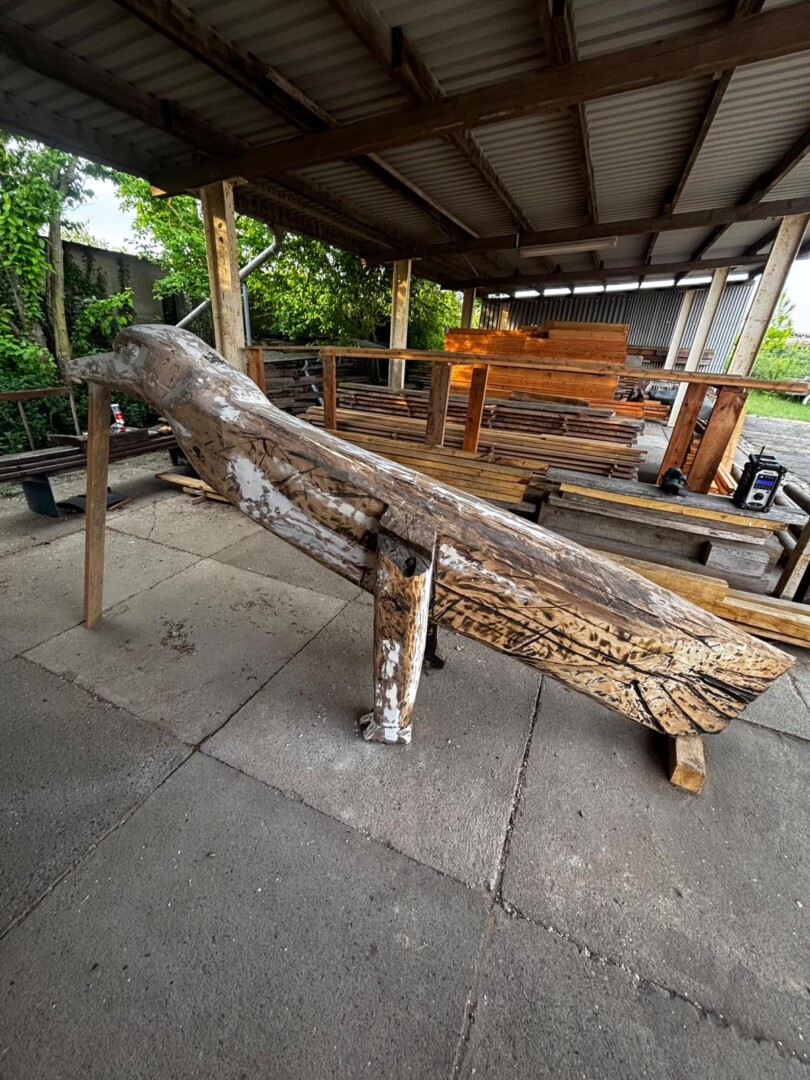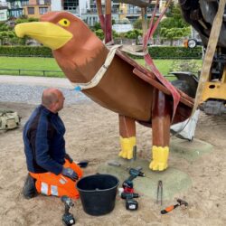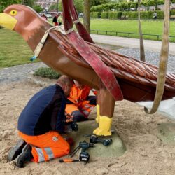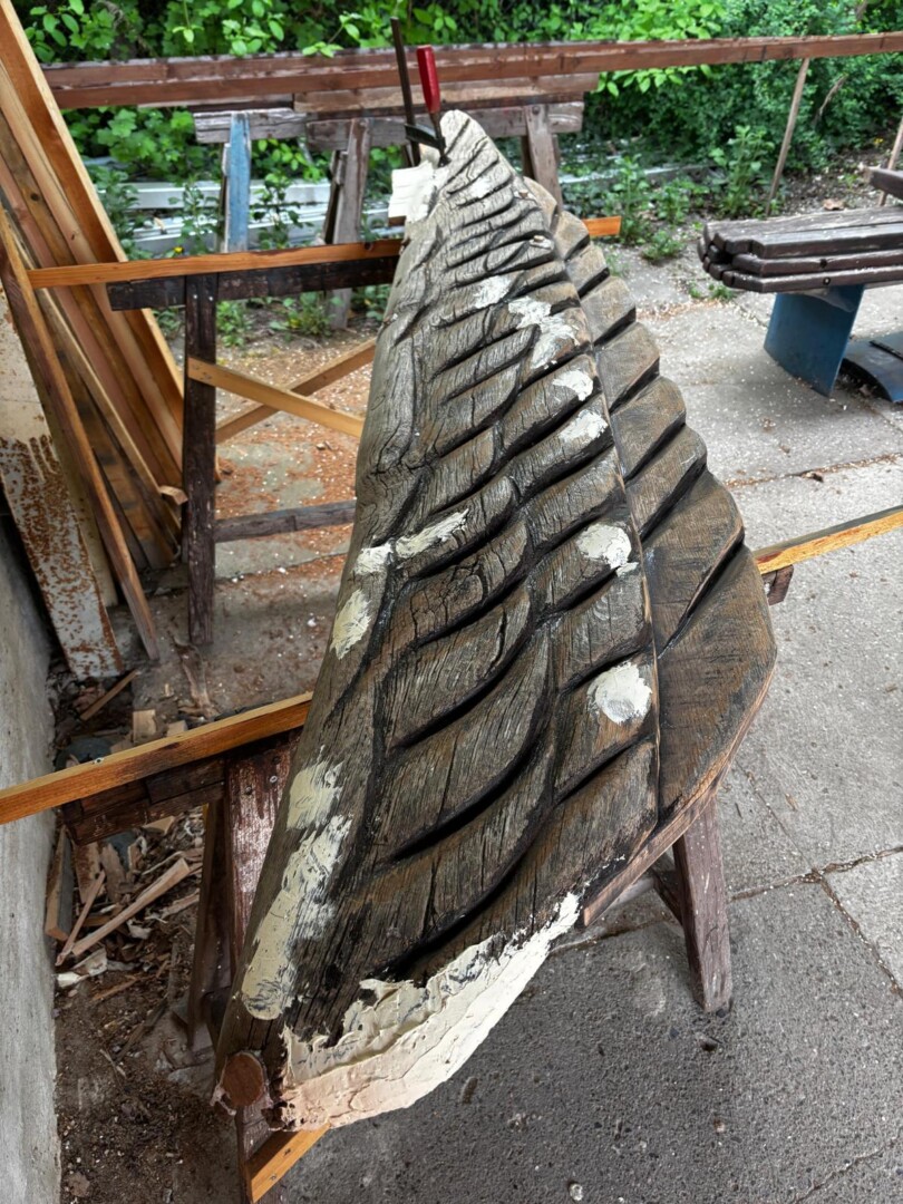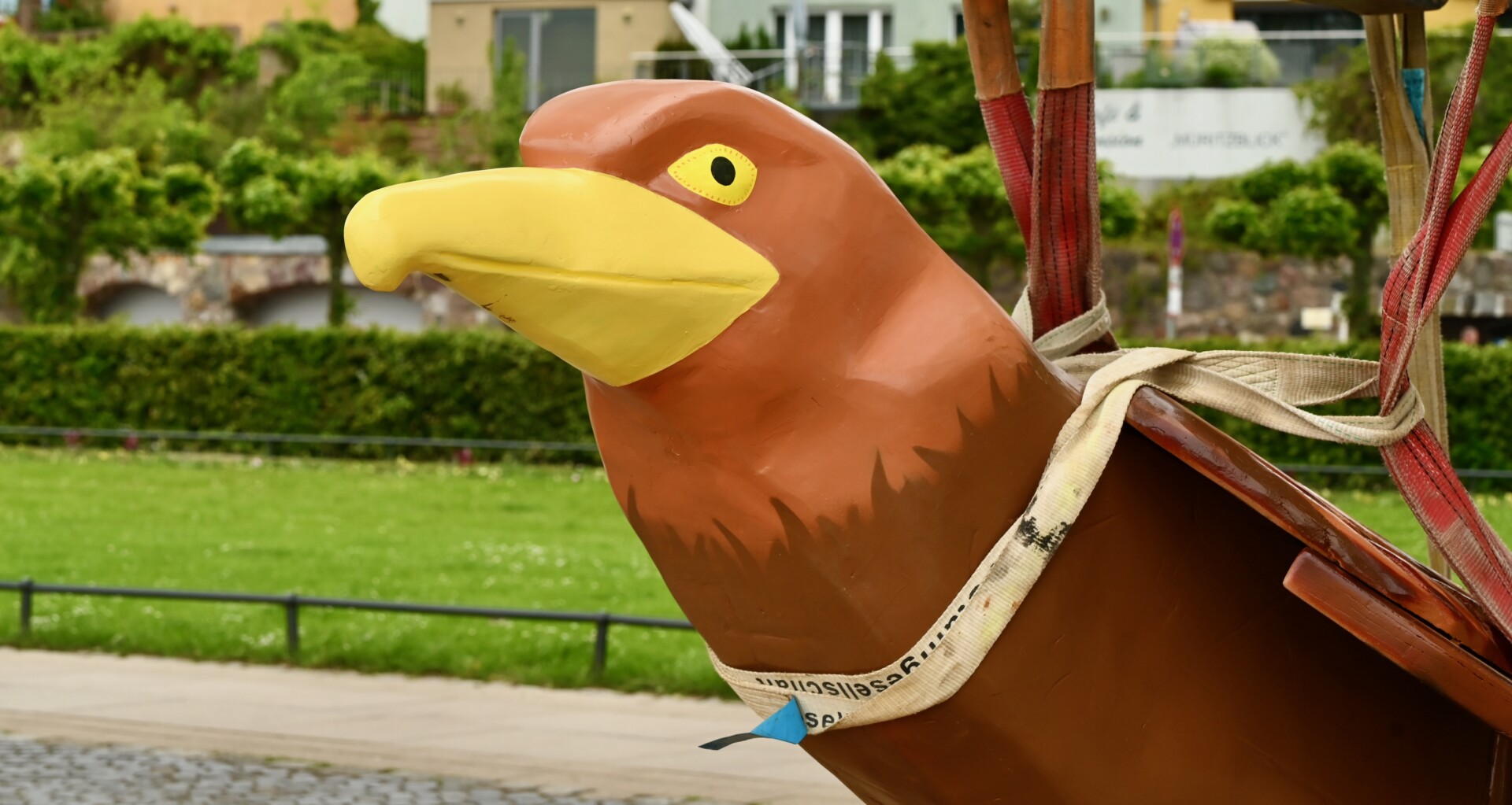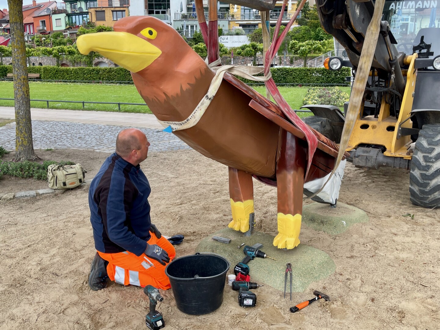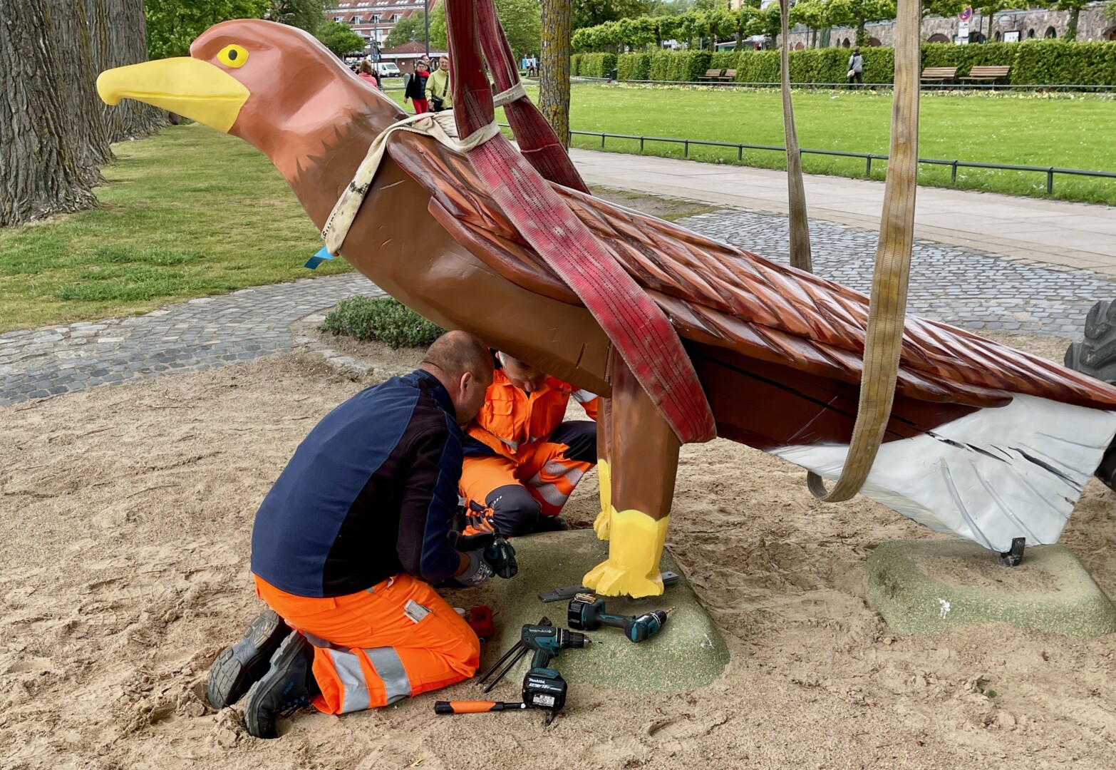 Anfang dieses Jahres ergab eine Überprüfung, dass der Seeadler dringend zur Kur muss – er bröckelte hier und da, die Rillen war so groß, dass sie eine Gefahr für kleine Kinderfingerchen darstellten. Also ab mit ihm in die Stadtbauhof-Klinik. Beim Auseinandernehmen zeigte sich dann, wie wichtig die Entscheidung war – im Inneren fanden die Mitarbeiter viel morsches Holz.