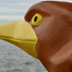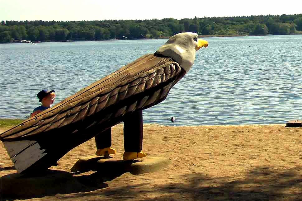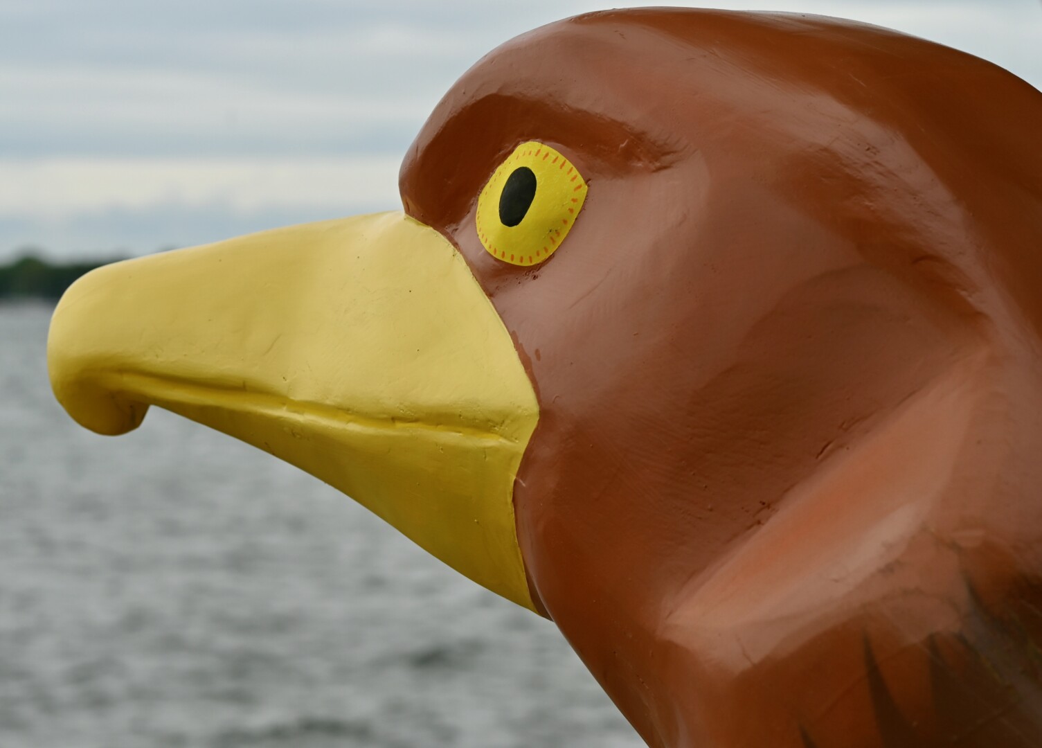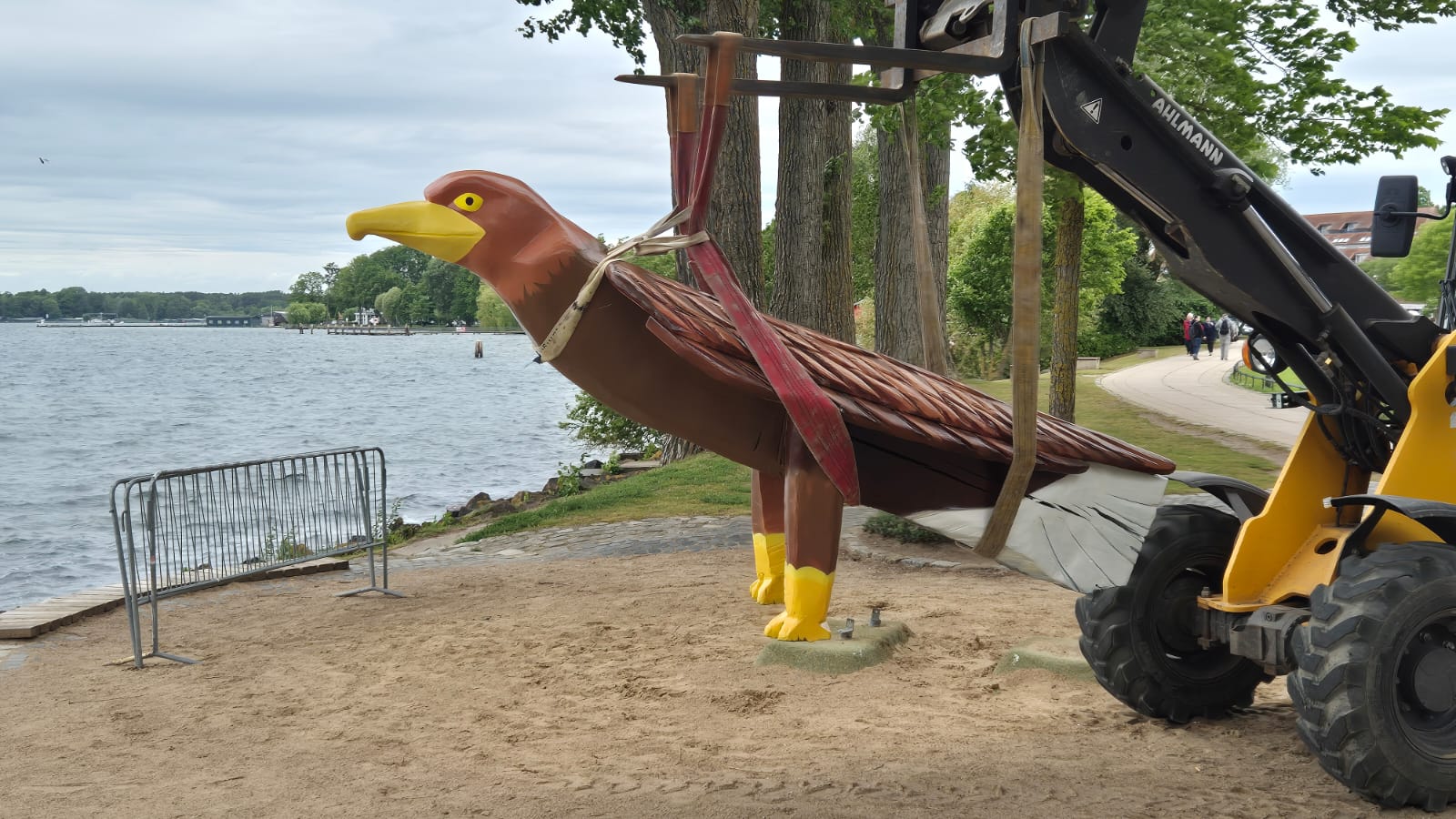 Der „Vogel“ entwickelte sich schnell zu einem beliebten Fotomotiv – entweder, weil Kinder ihn eroberten oder weil die Sonne in seinem Blickfeld in der Müritz versank. Doch ein paar Jahre später, 2019, gefiel er nicht mehr allen, denn es stellte sich heraus, dass es sich dem Aussehen nach um einen Weißkopfadler (Foto links) handelte, und den gibt’s in der Müritz-Region nicht, sondern in Amerika. Eine junge Dame, die seinerzeit ein Freiwilliges MOffenbar mit Erfolg: Durch einen neuen Anstrich ist das beliebte Fotomotiv zu einem einheimischen Seeadler geworden.