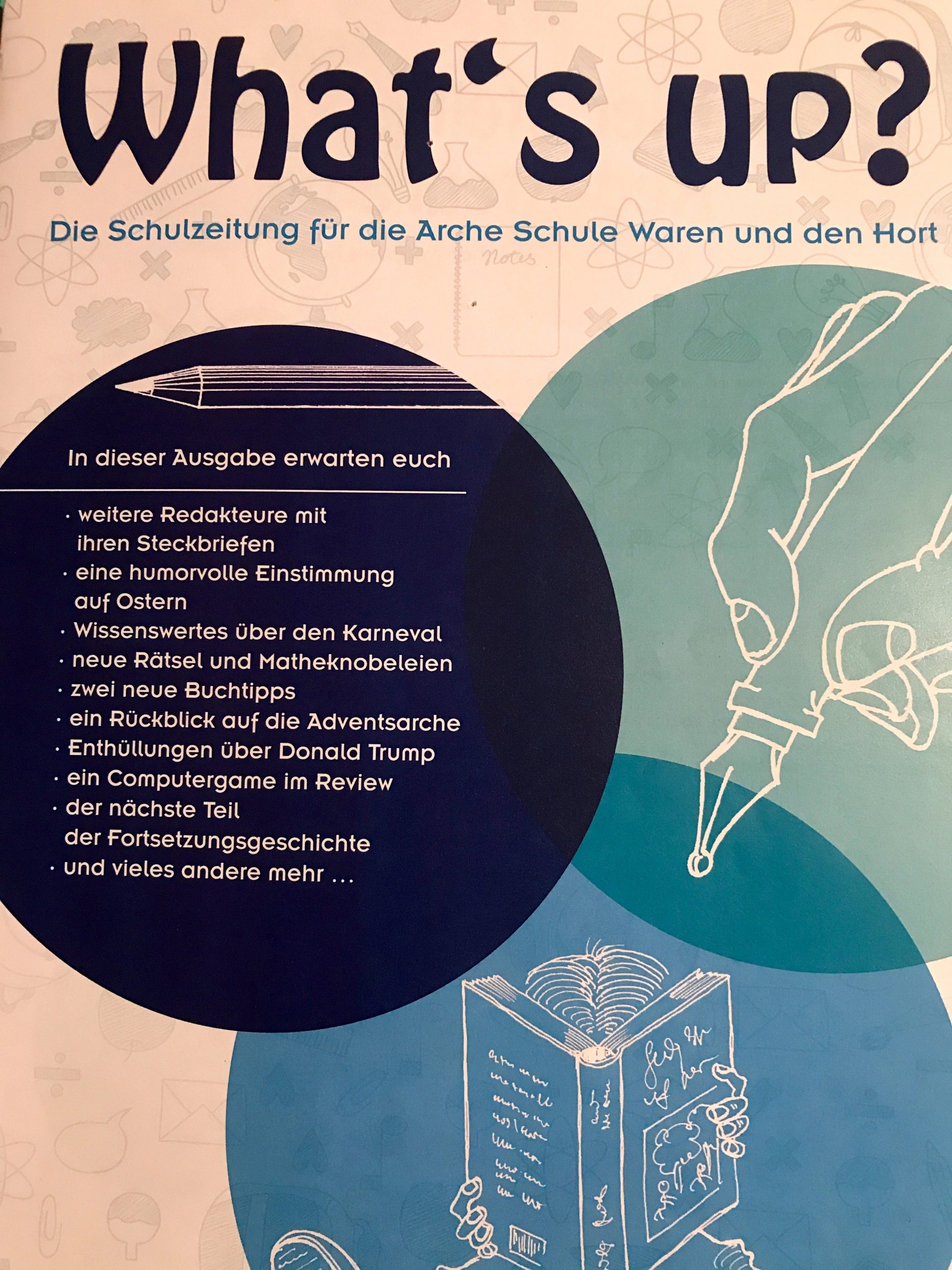 Seit mehr als einem Jahr gibt es an der Arche-Schule die Zeitung „What’s up“, die viermal im Jahr erscheint. Derzeit treffen sich die neun Redakteure einmal in der Woche, um die nächste Ausgabe, die noch vor Weihnachten erscheinen soll, vorzubereiten. Und da sieht es nicht anders aus, als in „richtigen“ Redaktionen: Themen finden, recherchieren, fotografieren, schreiben, und, und, und. Betreut werden die kleinen Reporter von zwei Mamis, die ebenfalls Spaß daran haben, eine Zeitung zu machen.