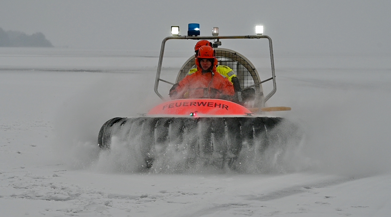 Wenig später präsentierten Warener Feuerwehrleute in Begleitung eines Kamera-Teams die Eisrettung. Ein Reporter – natürlich gut ausgerüstet – brach ins Eis ein und ließ sich retten.