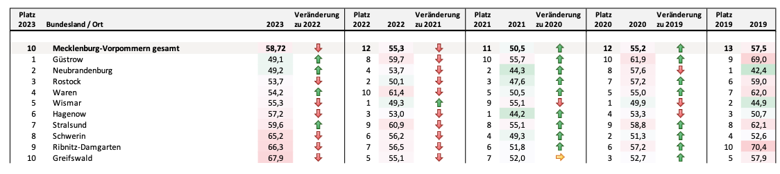 Im Jahr 2022 brauchten die Mitarbeiter des Warener Finanzamtes noch 61,4 Tage – also eine deutliche Verbesserung. Von den zehn Finanzämter in Mecklenburg-Vorpommern ist das Güstrower das schnellste mit 49,1 Tagen, das Greifswalder mit 67,9 Tagen das langsamste. Waren landet auf Platz vier. Und Mecklenburg-Vorpommern rangiert im Bundesländer-Vergleich auf Platz 10 von 16. Ganz unten steht das Land Brandenburg.
