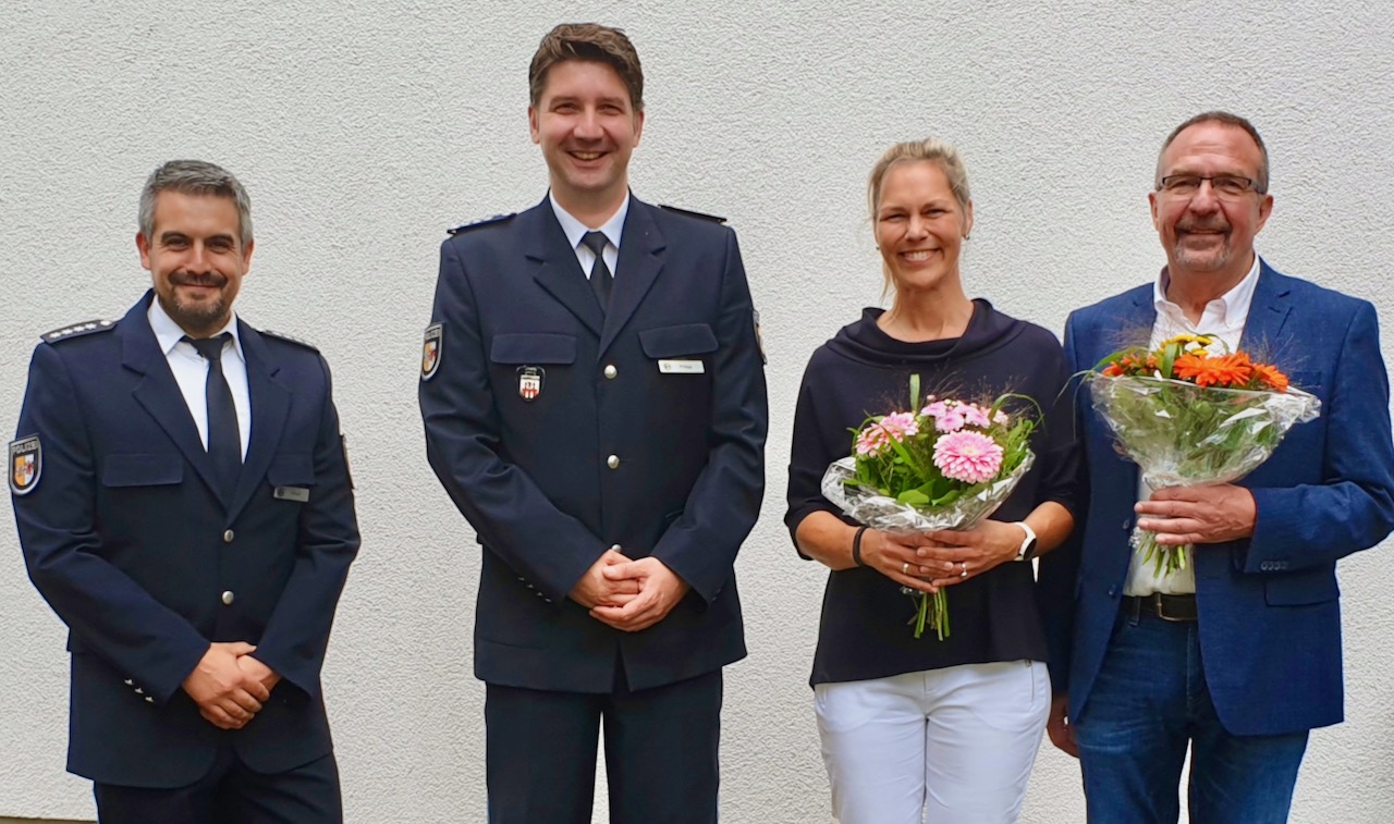 Er übergab den symbolischen Staffelstab an Kriminalhauptkommissarin Eike Wiethoff. Zu den ersten Gratulanten zählten der Leiter des Warener Polizeireviers, Stefan Philipp (2.v.l.), und sein Stellvertreter Sebastian Arend (l.).