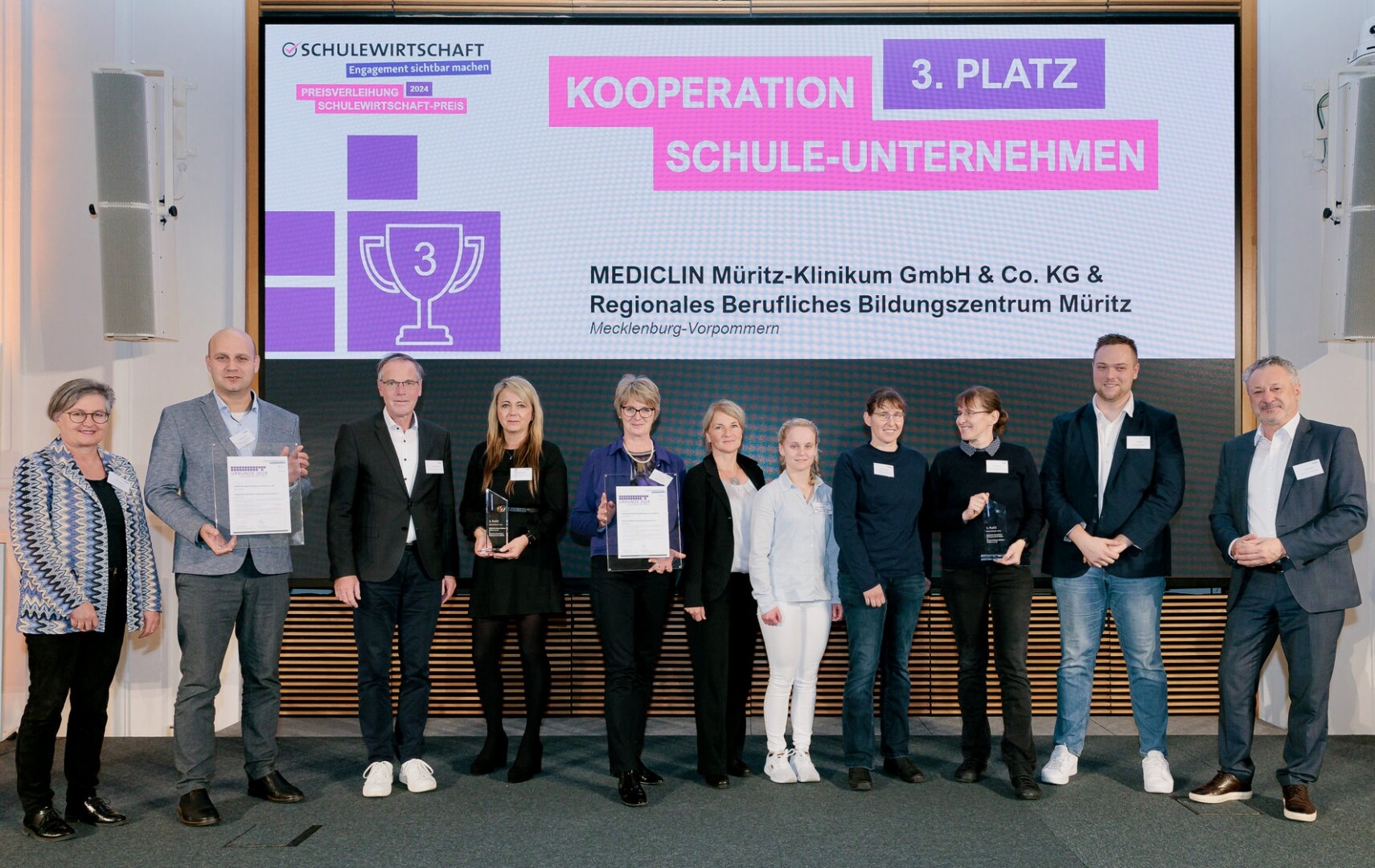 Zusammen mit dem RBB Müritz holte sich das Krankenhaus den renommierten Schulewirtschafts-Preis für das Projekt „Crash-Kurs Erste Hilfe. Dieser Preis, verliehen von SCHULEWIRTSCHAFT Deutschland und gefördert durch das Bundesministerium für Wirtschaft und Klimaschutz, würdigt herausragendes Engagement in der beruflichen Orientierung von Jugendlichen.