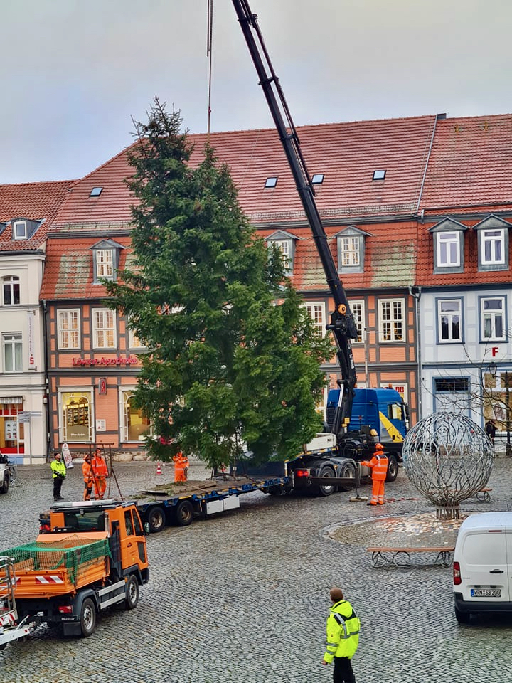 Jetzt hat auch Warens Markt einen Weihnachtsbaum. Das Prachtexemplar kommt aus dem Garten von Familie Dieckmann, die an der Feisneck wohnt.