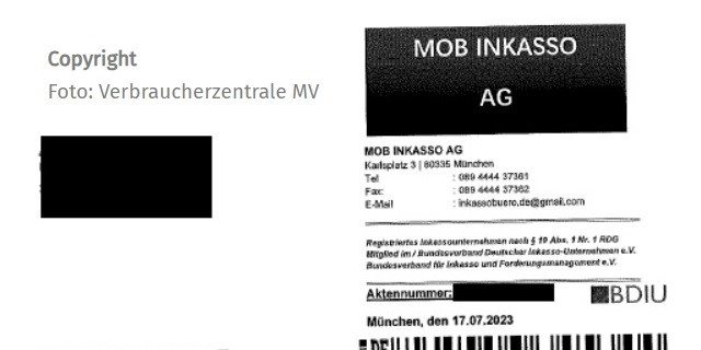 Immer wieder landen in den Briefkästen in Mecklenburg-Vorpommern Schreiben von vermeintlichen Inkassounternehmen. Derzeit wieder von der MOB Inkasso AG aus München. In dem vermeintlichen Inkassoschreiben wird dem Empfänger suggeriert, die aufgeführten Forderungen resultieren aus einer telefonischen Anmeldung zum Dienstleistungsvertrag bei „Lotto 6 aus 49“. Die Verbraucher sollen angeblich der kostenpflichtigen Dienstleistung mit ihren persönlichen Daten zugestimmt und den Betrag noch nicht beglichen haben.