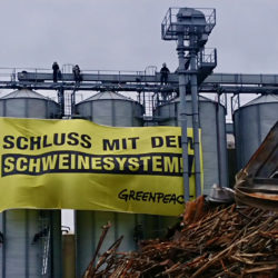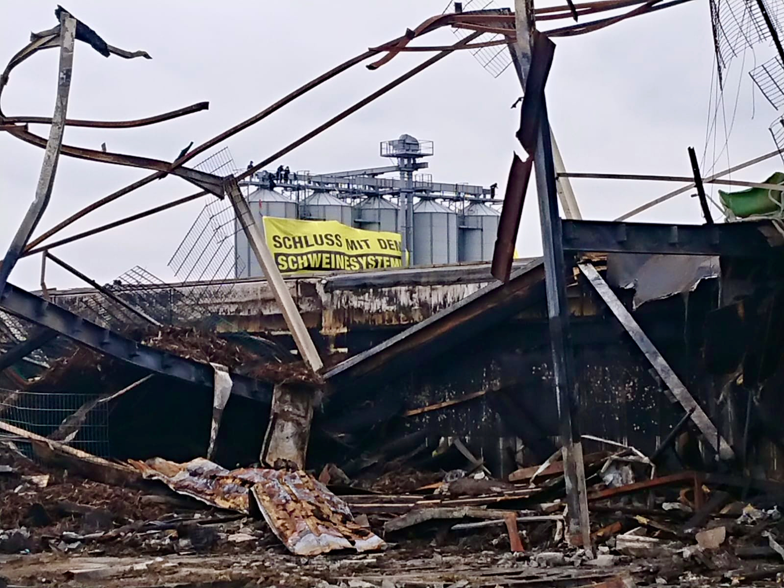 Einige Greenpeace-Helferinnen aus Hamburg hatten morgens zunächst den Zaun überklettern wollen und so das Wachpersonal am Tor auf sich gezogen –- während andere gegenüber über den Zaun kletterten. Sie stiegen auf hohe Futtertürme, wo sie gelbe Banner befestigten und sich daran anseilten. Mit Backhaus reden sie nur kurz. Man wolle weniger Tiere, esse weder Fleisch, noch Fisch oder Käse, sagt eine Aktivistin.