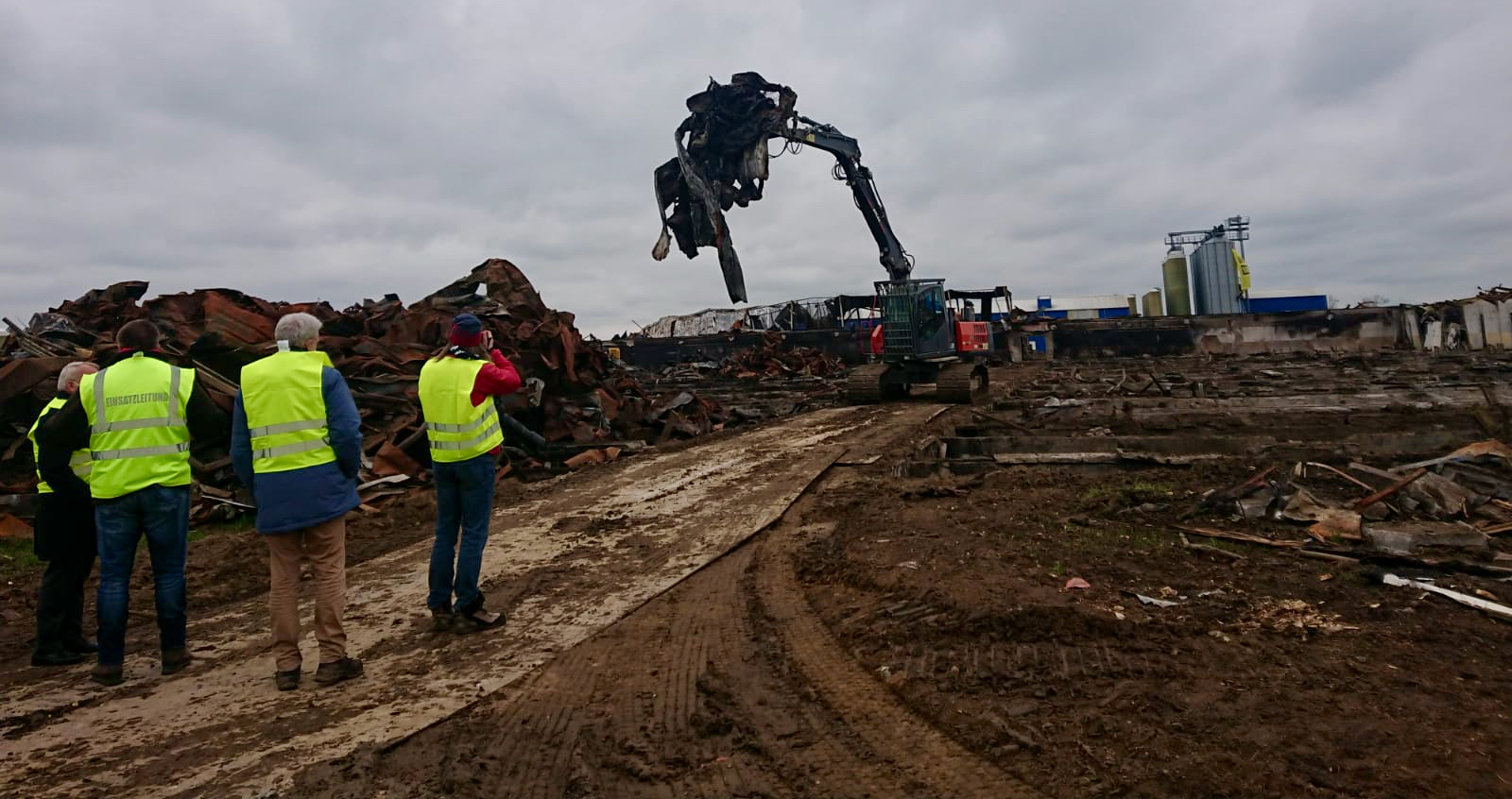 Unterdessen fahren unten sieben Bagger auf extra ausgelegten „Baggermatrazen“ an den Kellerruinen vorbei, in denen noch jede Menge Gülleschlamm liegt. Sie holen Bauschutt heraus, der auf Lastwagen verladen wird. Betreiber ist die LFD Holding aus Roßdorf in Sachsen-Anhalt (Landwirtschaftlichen Ferkelzucht Deutschland), die bundesweit elf solcher Anlagen betreibt.
