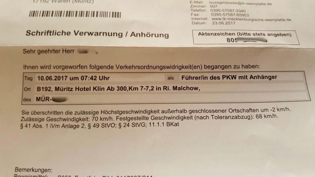 Der Landkreis hat jetzt erklärt, wie es zu der ominösen Verwarnung eines Autofahrers aus Waren gekommen ist. Zur Erinnerung: Der Müritzer hat ein Schreiben erhalten, in dem ihm vorgeworfen wird, die zulässige Höchstgeschwindigkeit um -2 km/h unterschritten zu haben. Dafür sollte er 15 Euro zahlen. Der Landkreis hat diesen Bescheid inzwischen zurückgenommen.