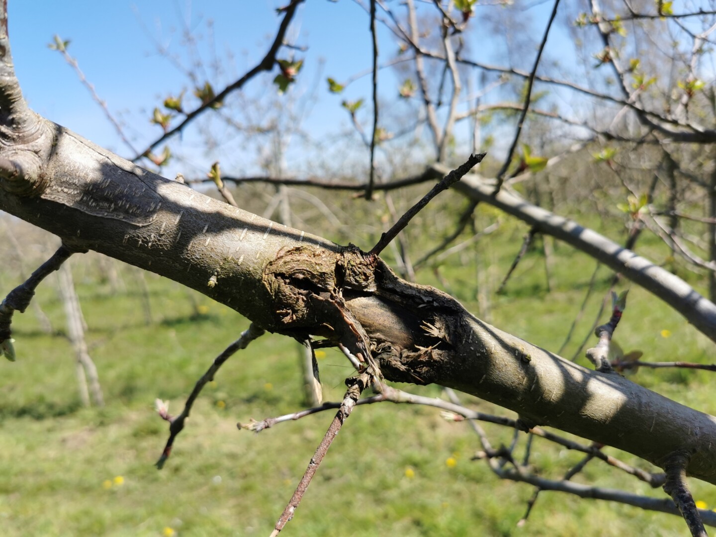 nach jedem Baum ausdrücklich zu empfehlen. Obstbaumkrebs wird von dem Pustelpilz Neonectria galligena ausgelöst. Durch die Infektion verfärbt sich die Rinde zunächst dunkel und sinkt ein, später entstehen Wucherungen und der Pilz breitet sich um den Zweig oder sogar den Stamm herum aus. Zweige die stark infiziert sind, sterben oberhalb der Infektion ab, der Baum wird geschwächt, trägt weniger und kleinere Früchte.
