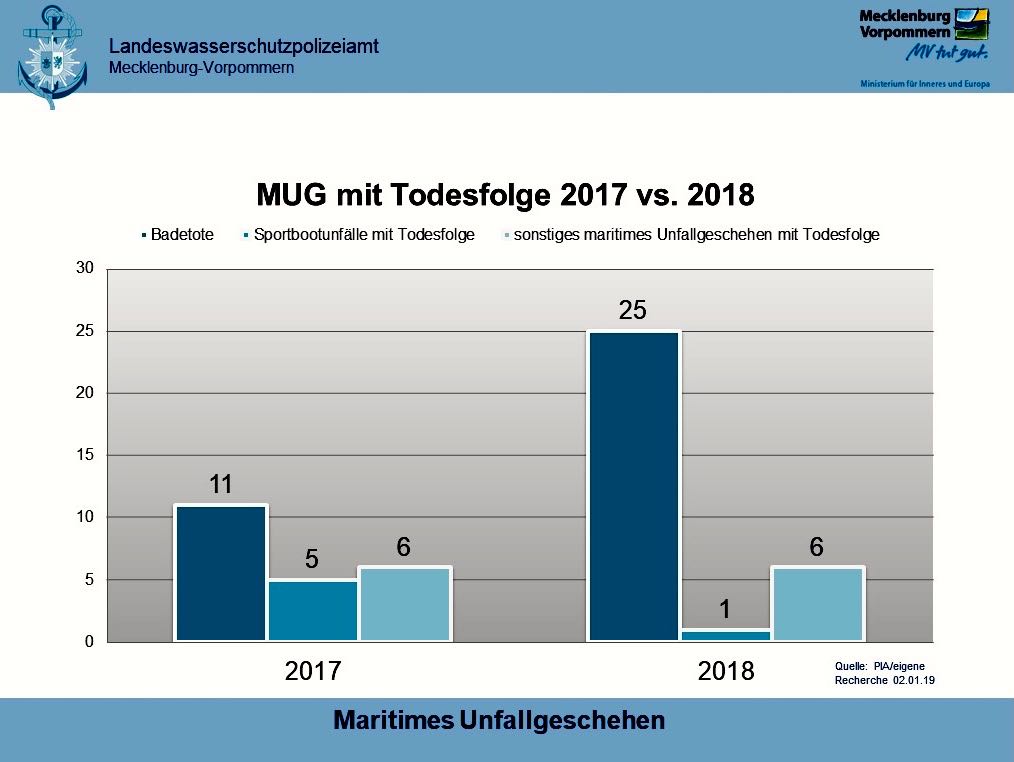 Im Jahr 2018 kam es an den Küsten, Binnenseen und Flüssen in Mecklenburg-Vorpommern zu 32 tödlich verunglückten Personen. Diese traurige Bilanz hat die Wasserschutzpolizei des Landes heute veröffentlicht.