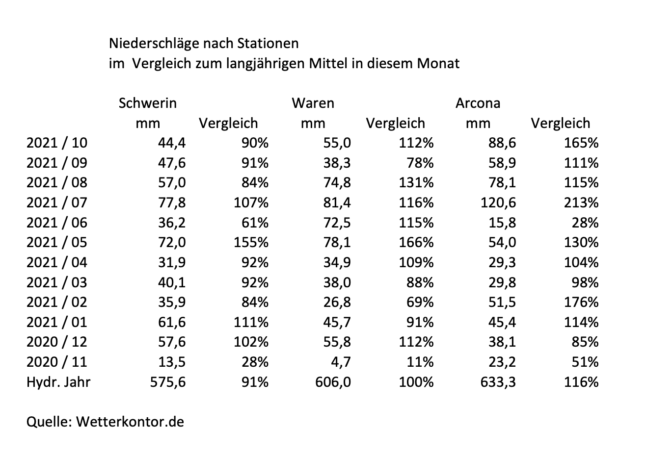 Der Wasserhaushalt im Boden von Mecklenburg-Vorpommern hat sich in seiner Gesamtheit betrachtet im vergangenen Jahr leicht erholt. Dies ist das Ergebnis einer Bilanz des hydrologischen Jahres (November 2020 bis Oktober 2021), die vom Umweltministerium vorgenommen wurde. „Die Summe der Niederschläge entsprach in großen Teilen Mecklenburg-Vorpommerns in etwa dem langjährigen Mittel. Nach den eher trockenen letzten zwei Jahren zeigt der Dürremonitor des Helmholtz-Instituts nunmehr nur noch für den äußersten Nordosten, insbesondere die Insel Usedom, und den äußersten Südwesten, wo die geringsten Niederschläge zu verzeichnen waren, eine außergewöhnliche oder extreme Dürre im Gesamtboden an“, erklärte der zuständige Minister Till Backhaus.