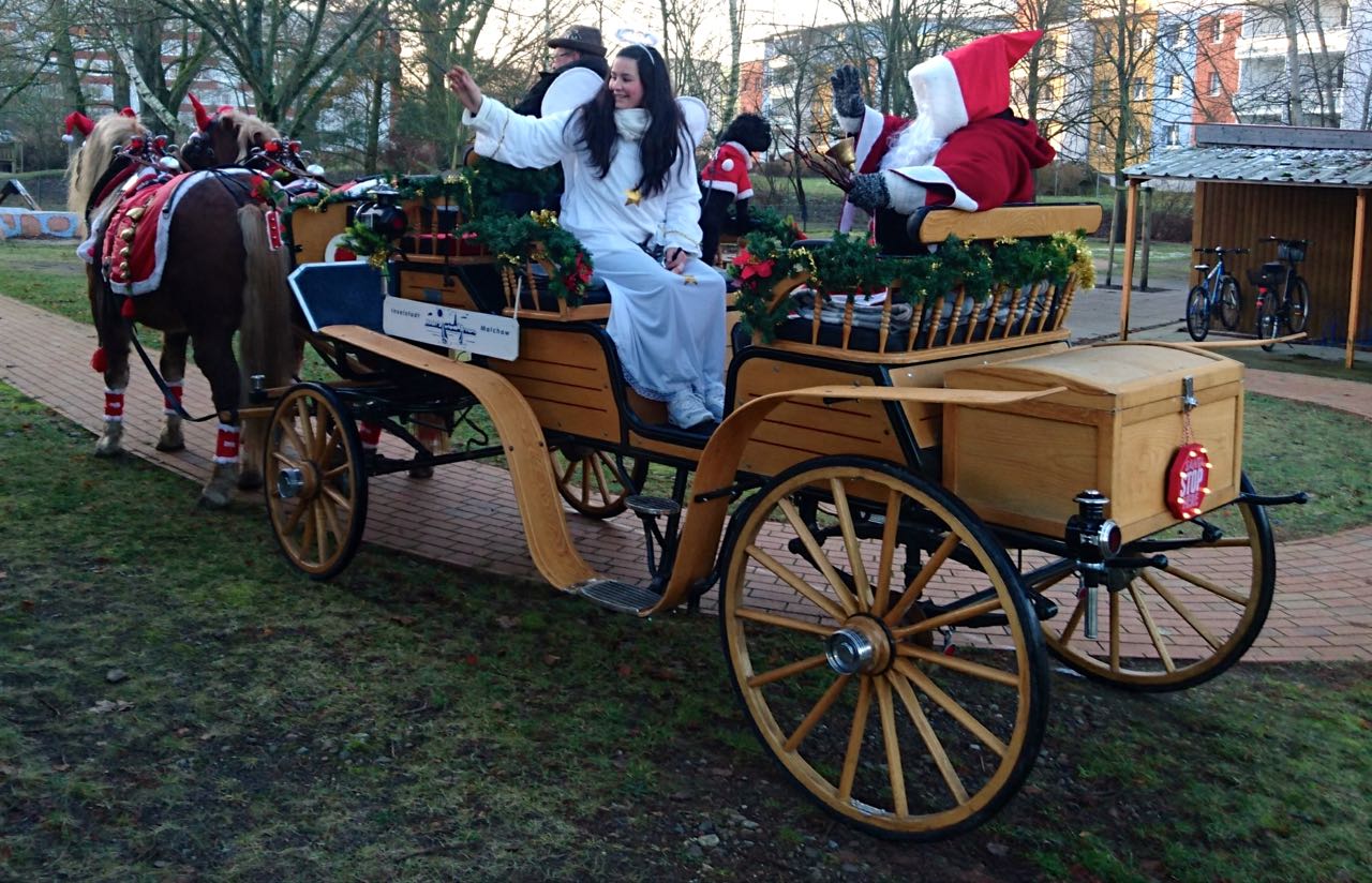 Überraschung gelungen: Die Kinder und Erzieher der Kita „Spatzennest“ in Malchow haben heute Morgen nicht schlecht gestaunt, als der Weihnachtsmann mit der Kutsche auf den Hof angefahren kam.
