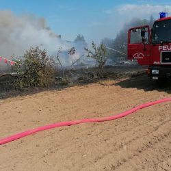 Zu einem Großbrand mussten am Nachmittag mehrere Feuerwehren ausrücken. Ein Weizenfeld war nahe Knüppeldamm in Brand geraten. Das Feuer breitete sich rasend schnell aus und erfasste auch ein Wohnhaus. Unzählige Feuerwehren aus der gesamten Region sind im Einsatz.