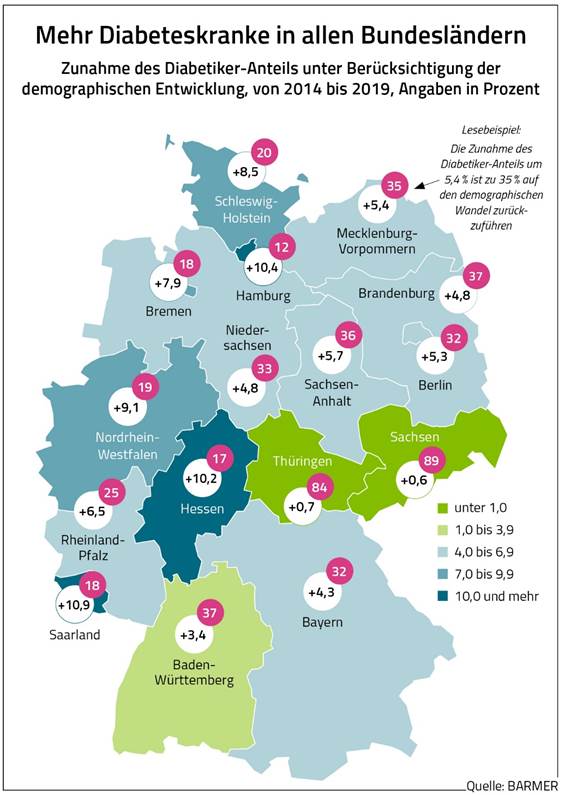 Der prozentuale Anteil von Diabetiker an der Bevölkerung in den jeweiligen Bundesländer muss in Relation zum Durchschnittsalter betrachtet werden. Im Moment stehen die geburtenstarken Jahrgänge vor den Toren der Rente. Durch die demografischen Umstände sind ein nicht unerheblicher Teil der Jüngeren dem Geld und der Arbeit hinterhergezogen und „verjüngen“ den Westen der nunmehr mit deutlich niedrigen Zahlen bei Diabetikern aufwarten kann. Zudem lassen sich immer mehr Rentner aus den Altbundesländern im billigem Osten nieder. Wir „importieren“ also einen Großteil der potentiellen Risikogruppe und ziehen den Altersdurchschnitt besonders in MV künstlich nach oben.