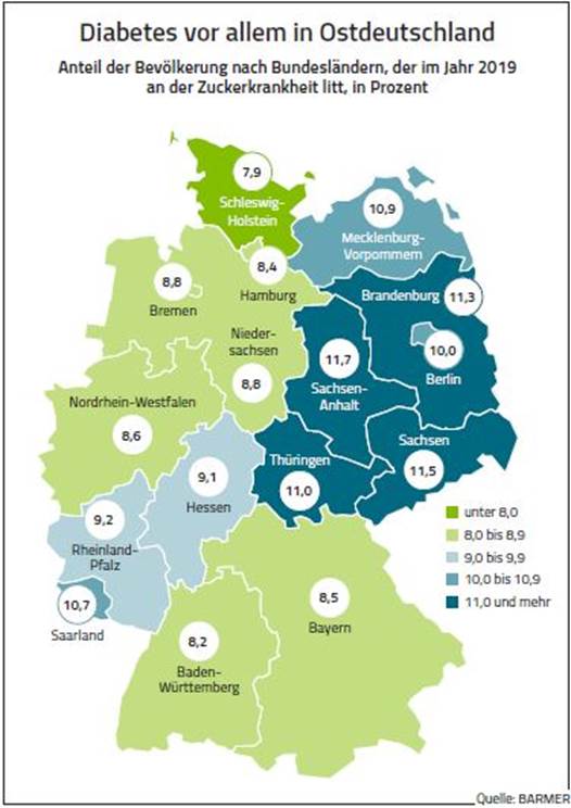 Der prozentuale Anteil von Diabetiker an der Bevölkerung in den jeweiligen Bundesländer muss in Relation zum Durchschnittsalter betrachtet werden. Im Moment stehen die geburtenstarken Jahrgänge vor den Toren der Rente. Durch die demografischen Umstände sind ein nicht unerheblicher Teil der Jüngeren dem Geld und der Arbeit hinterhergezogen und „verjüngen“ den Westen der nunmehr mit deutlich niedrigen Zahlen bei Diabetikern aufwarten kann. Zudem lassen sich immer mehr Rentner aus den Altbundesländern im billigem Osten nieder. Wir „importieren“ also einen Großteil der potentiellen Risikogruppe und ziehen den Altersdurchschnitt besonders in MV künstlich nach oben.