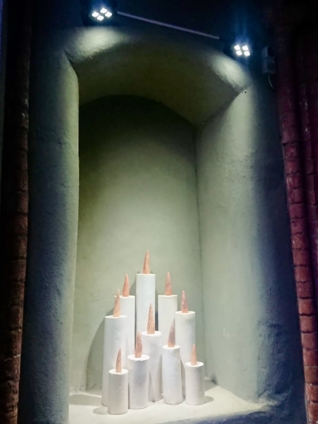 “Ich wollte, dass eine gewisse Dynamik von den Kerzen ausgeht und zugleich, dass sie auch Ruhe ausstrahlen”, hatte Poppe seine Idee für diese Arbeit begründet. Es handelt sich um zehn weiß glasierte Kerzen aus Steinzeug, die bis zu 80 Zentimeter hoch sind. Poppe hat die Zahl der Kerzen der Geometrie in der Nische angepasst, wie er sagte. Die Kerzen sind gesichert und sollen abends beleuchtet werden. Dazu gibt es eine Info-Tafel über die Historie.