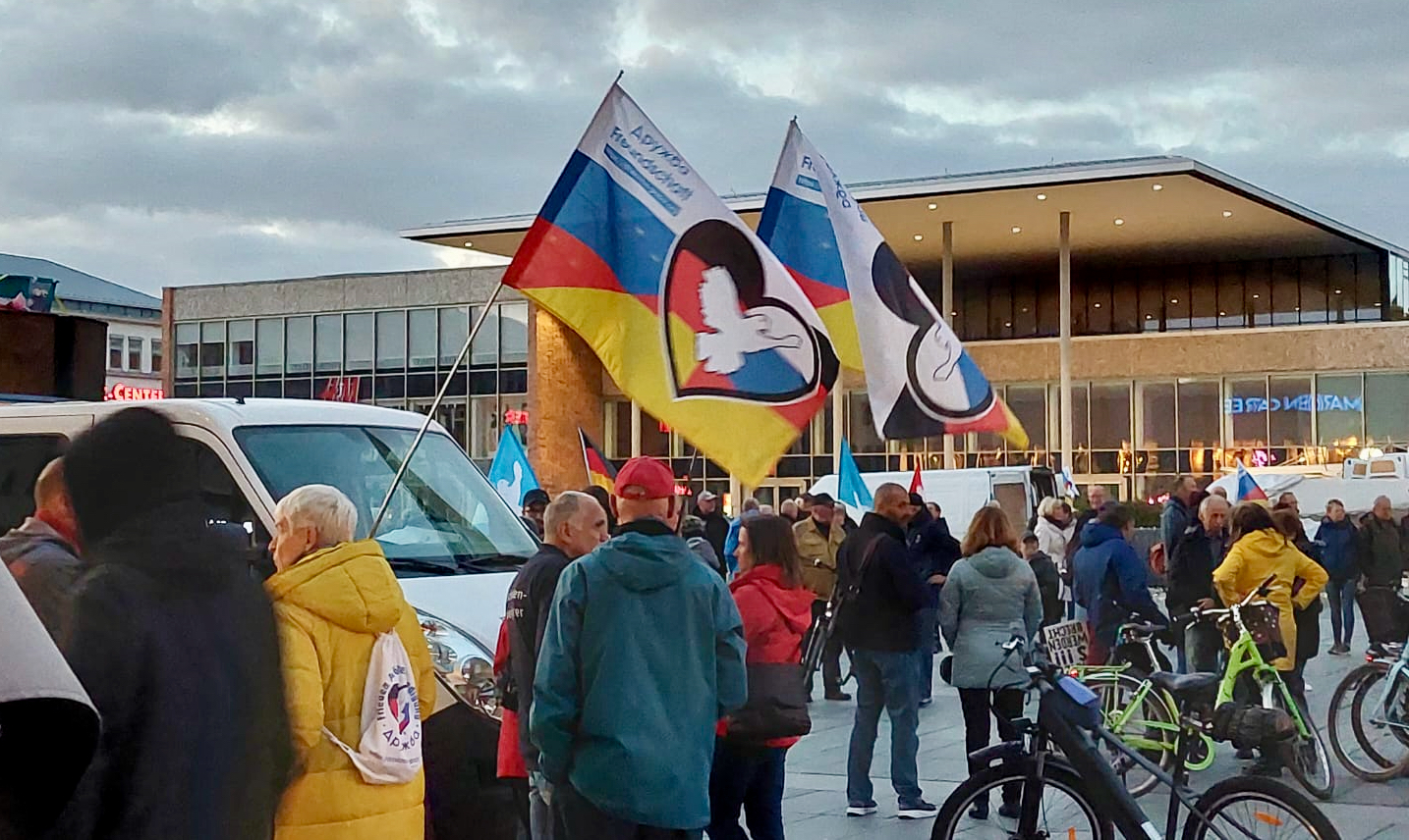 So wurden in Neubrandenburg rund 500 Protestteilnehmer gezählt, ein Viertel weniger als sonst. Hier gab es erstmals keine Corona-Protesttafeln, dafür aber mehr Deutschlandfahnen als sonst. Auf einem Plakat wurde „der Nato-Austritt Deutschlands“ gefordert und der Veranstalter sprach von der Dollar-Währung, die die Welt beherrsche. Das Geld sei die Ursache aller Probleme, meinte der Mann, ohne das genauer auszuführen. Bei vielen Teilnehmern gab es auch viele fragende Gesichter. Trotzdem zog man zusammen mit einigen lokalen AfD-Größen durch die Ihlenfelder Vorstadt und zurück zum Markt.