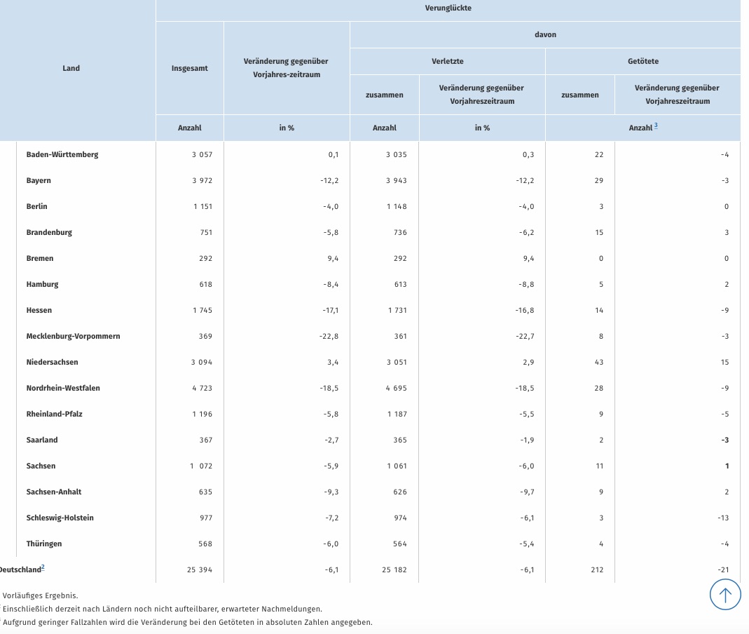 Im Januar 2019 sind 212 Menschen auf deutschen Straßen ums Leben gekommen, das waren 21 Verkehrstote weniger als im Januar 2018. Wie das Statistische Bundesamt nach vorläufigen Ergebnissen weiter mitteilt, wurden rund 25 200 Menschen im Straßenverkehr verletzt. Das entspricht einer Abnahme um 6,1 %.