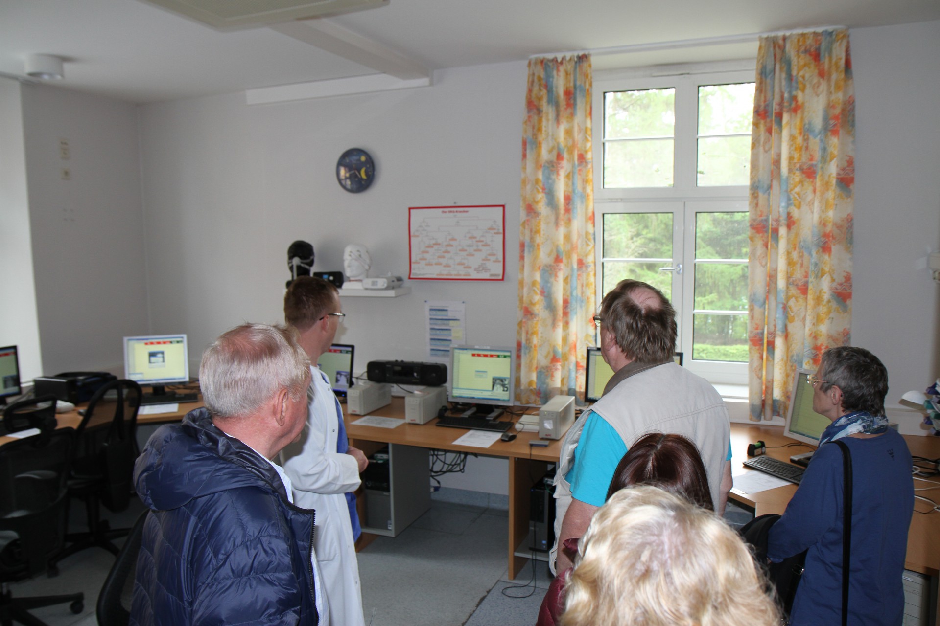 Beim Hausarzt ist Herr Pötzel schon seit längerem in Behandlung. So richtig ist die Ursache aber noch nicht gefunden. Da kam der Infotag des Schlaflabores genau richtig: Er und seine Frau hörten sich die kurzweiligen und sehr informativen Vorträge von Dr. Ferenczi (leitender Facharzt des Schlaflabores) undTim Grage (Firma inspire, die einen Zungenschrittmacher entwickelt haben) im Medienraum an. Danach ging es direkt ins Schlaflabor, wo die Besucher das Herzstück des Schlaflabors mit unzähligen Monitoren und viel modernster Technik sowie ein Patientenzimmer besichtigten.
